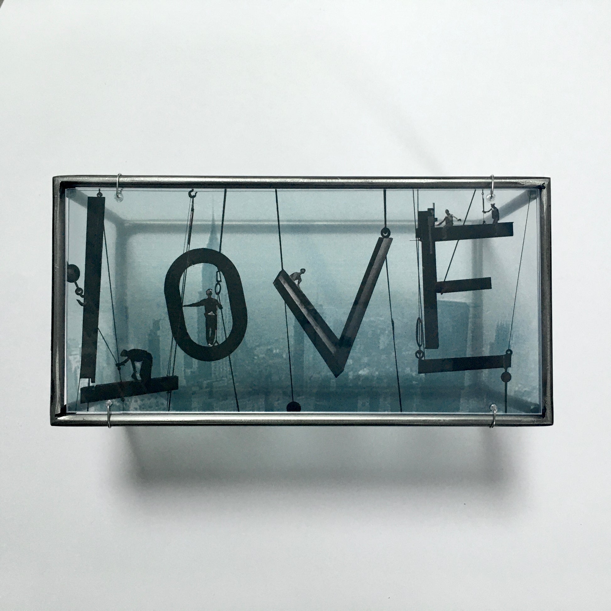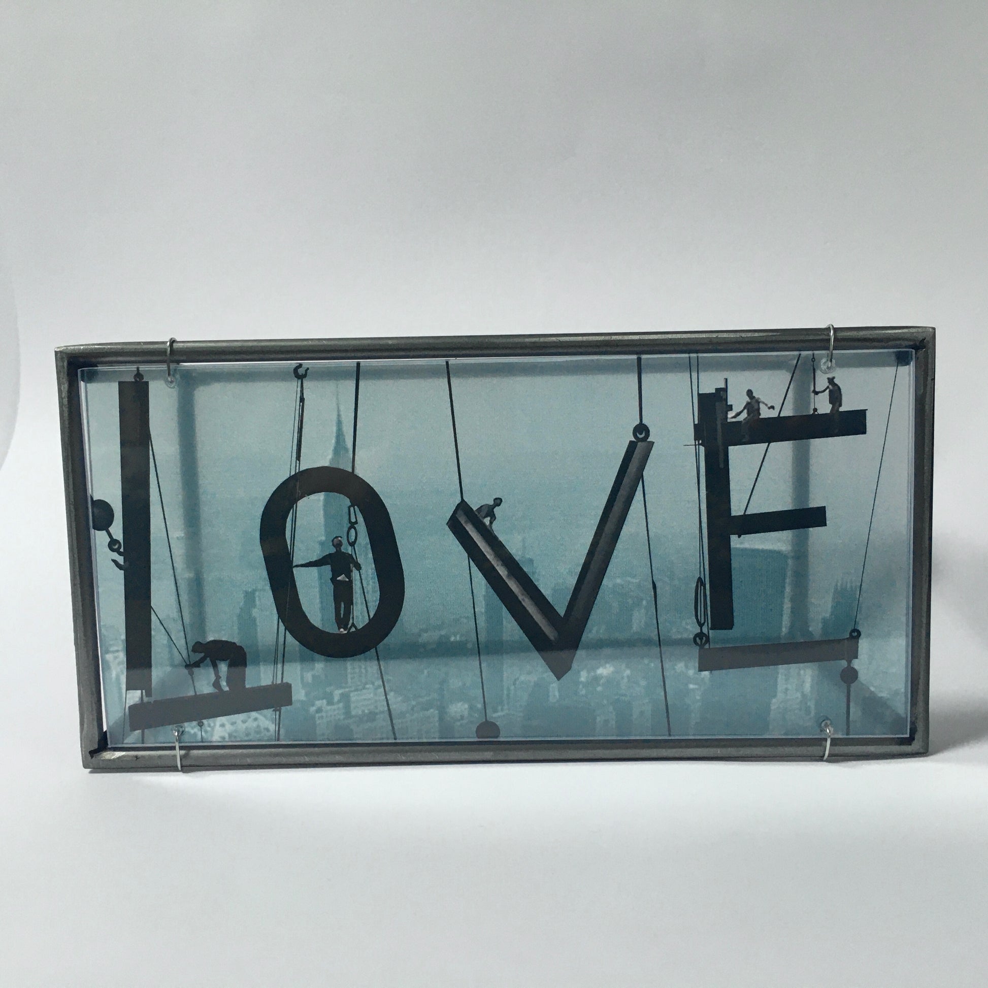 This stylish 'love' sign wall decor, also titled 'Love Under Construction' is an original sculpture using vintage photography of New York, with a blue tint and the skyscraper construction workers positioning iron girders. Perfect gift for the 6th Wedding Anniversary normally celebrated with iron, or any couple who understands that love is a construction in progress. These are handmade by us and each one is signed on the frame by Furst_Ori.