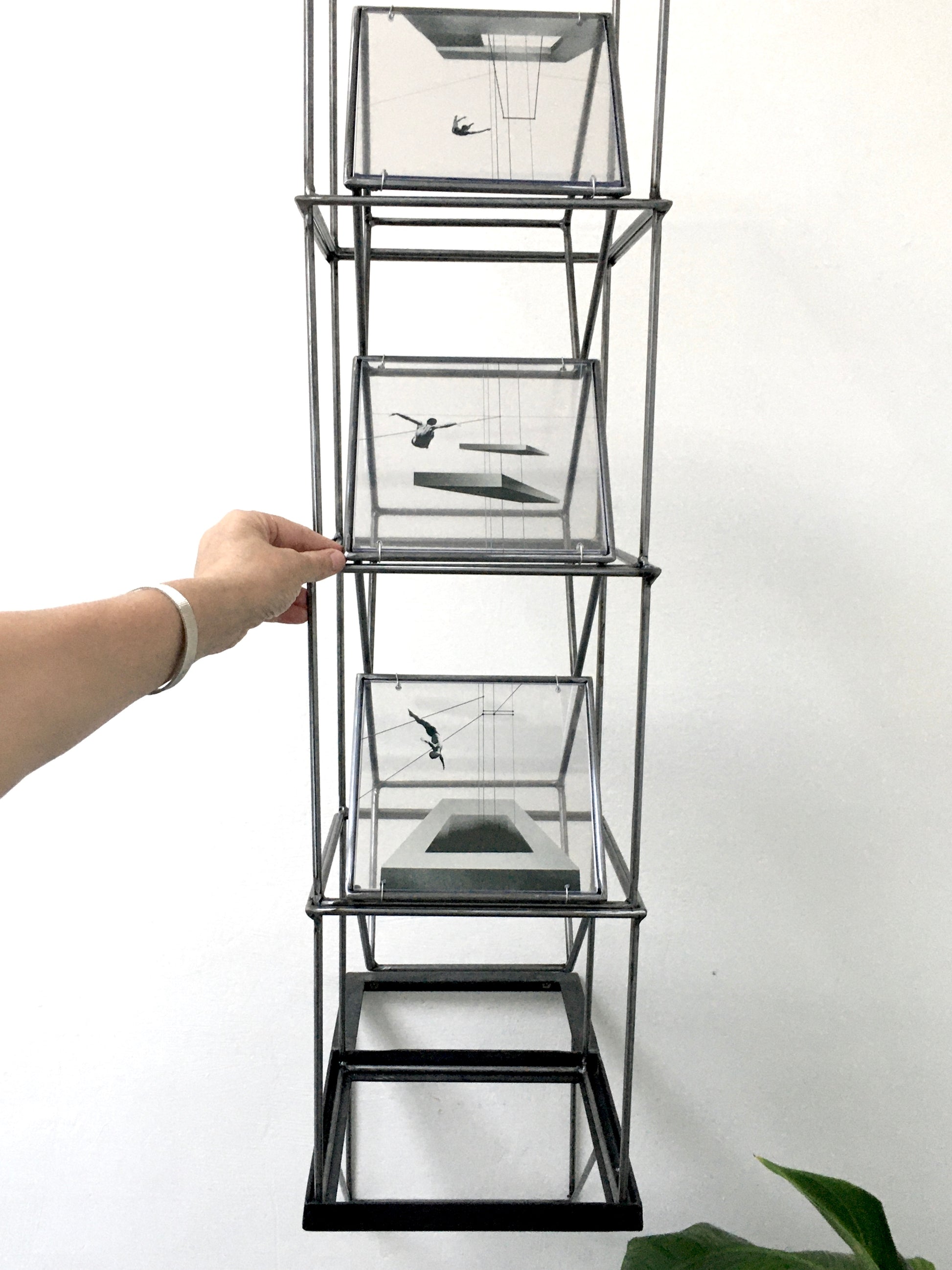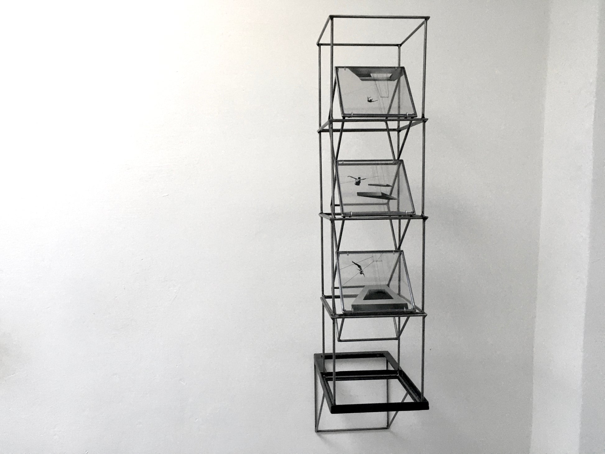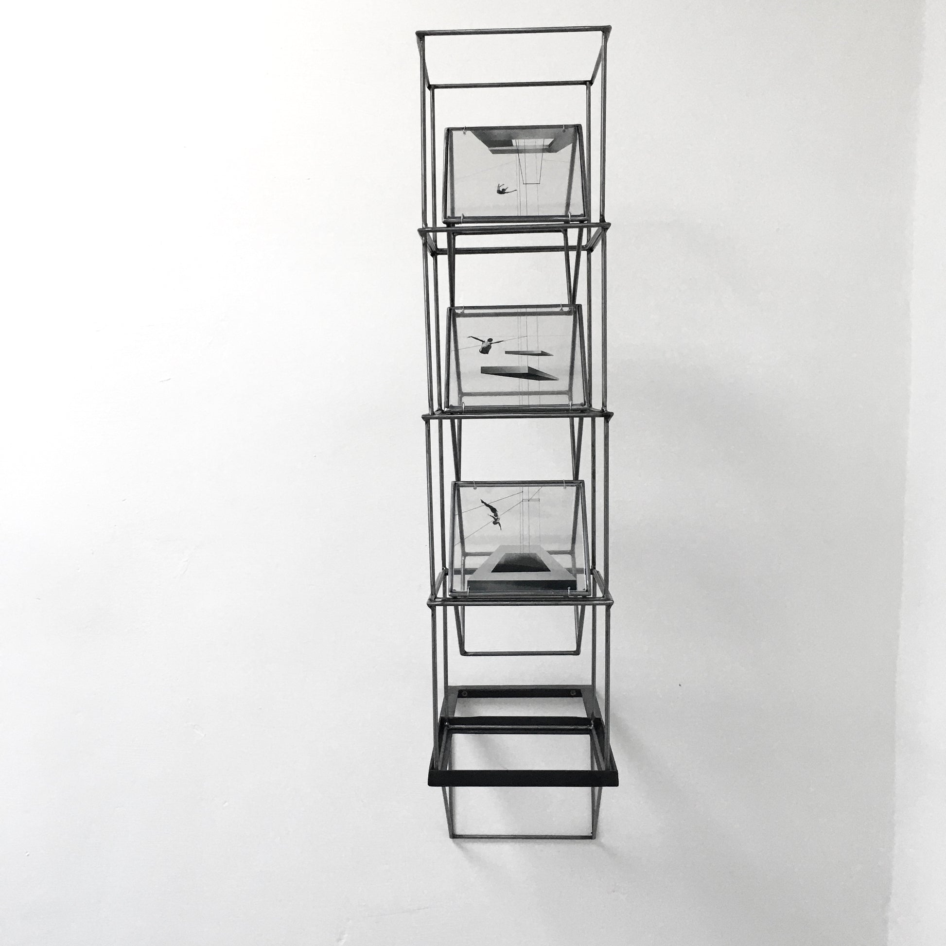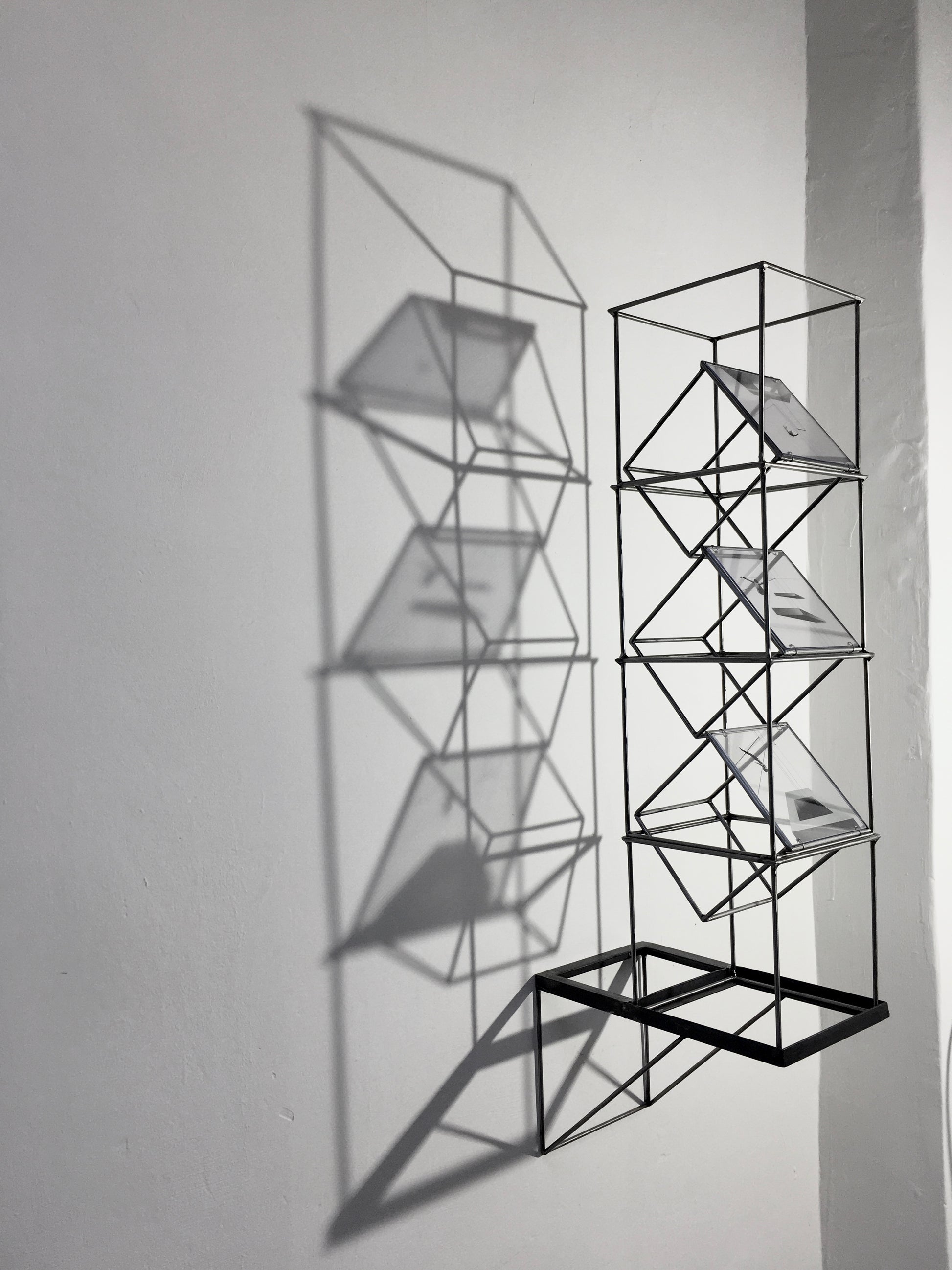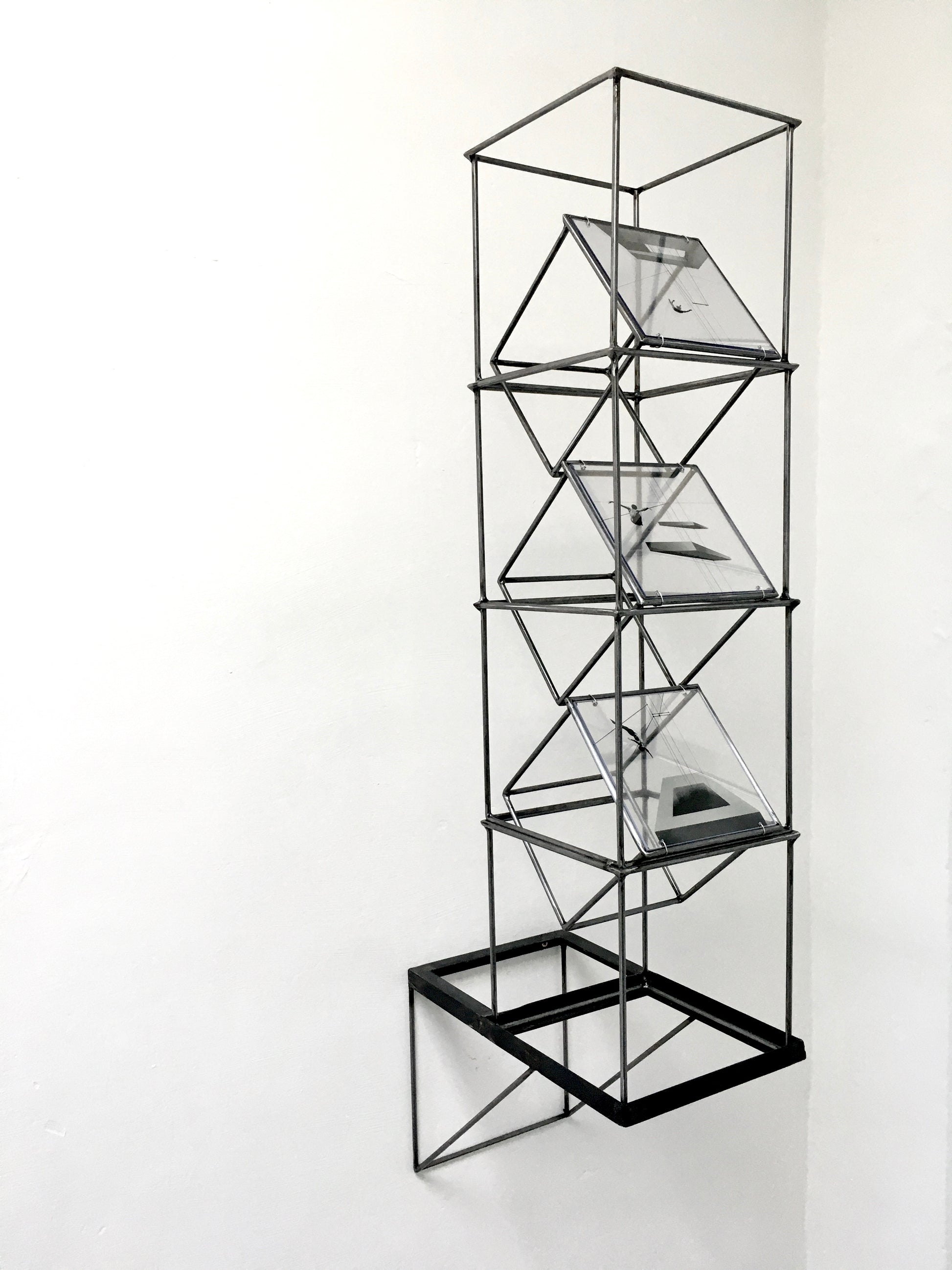 This artwork is composed of two pieces: a modular system forming a near one meter tower of interlocking steel bar cubes with a sequence of three original high quality transparent acrylic prints and a wall structure that fixes the tower to the wall. Appropriate wall screws are provided (only two are needed) and the entire structure is lightweight (can be mounted on plasterboard walls) and easy to assemble.