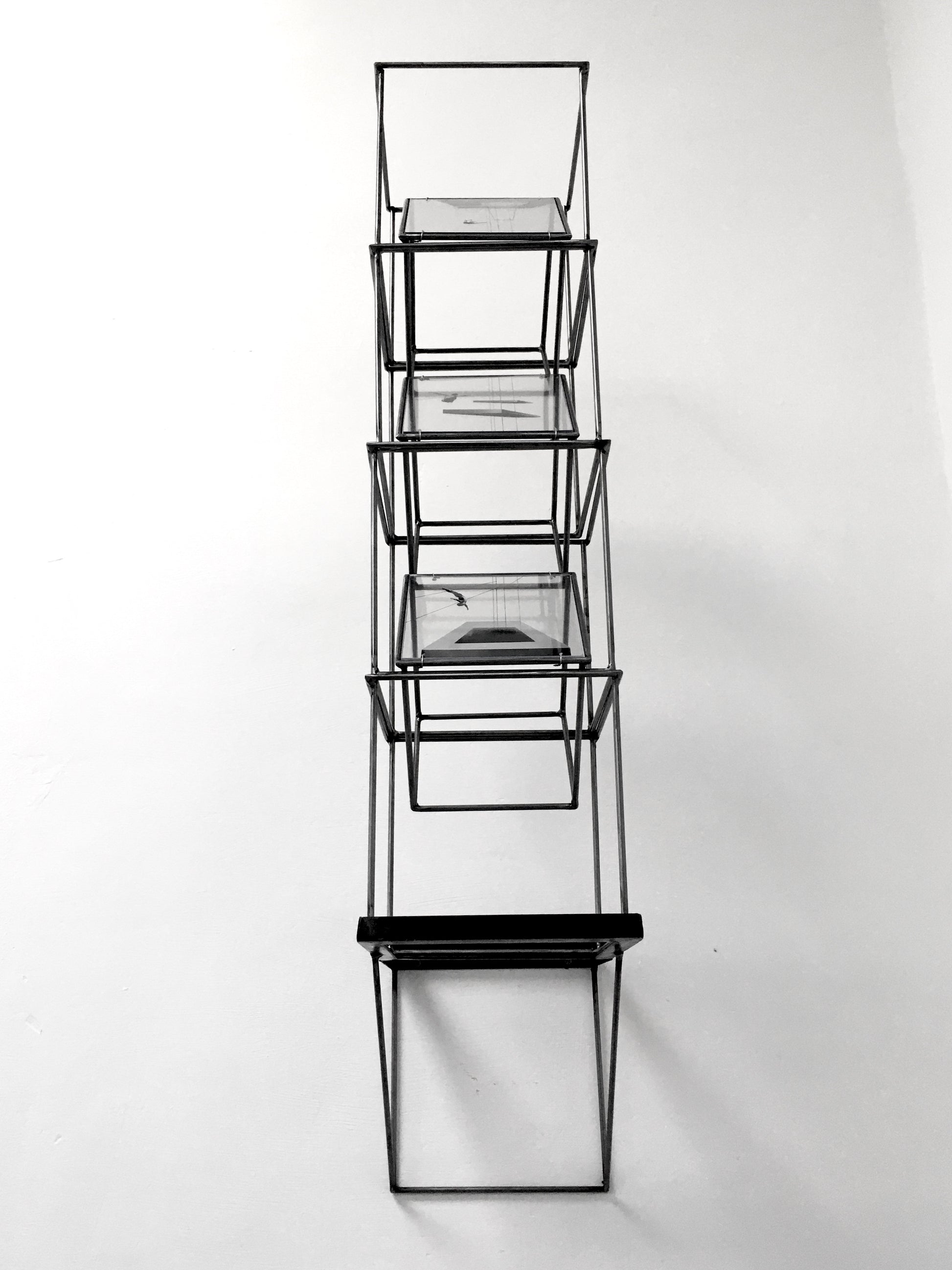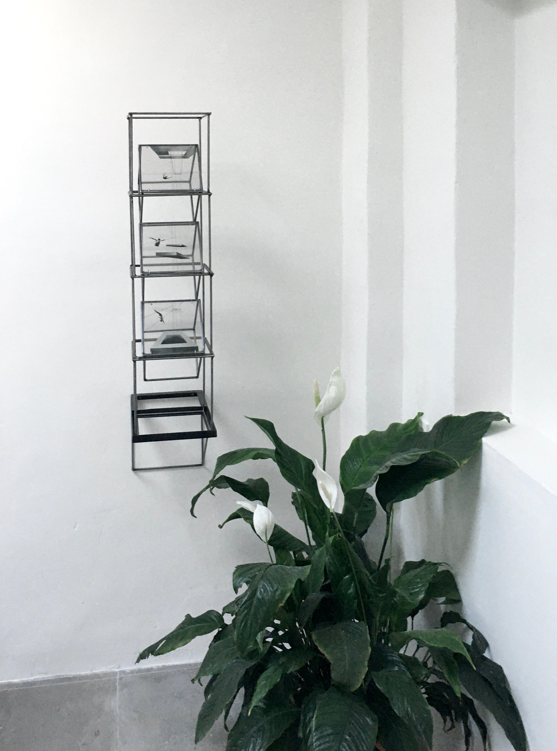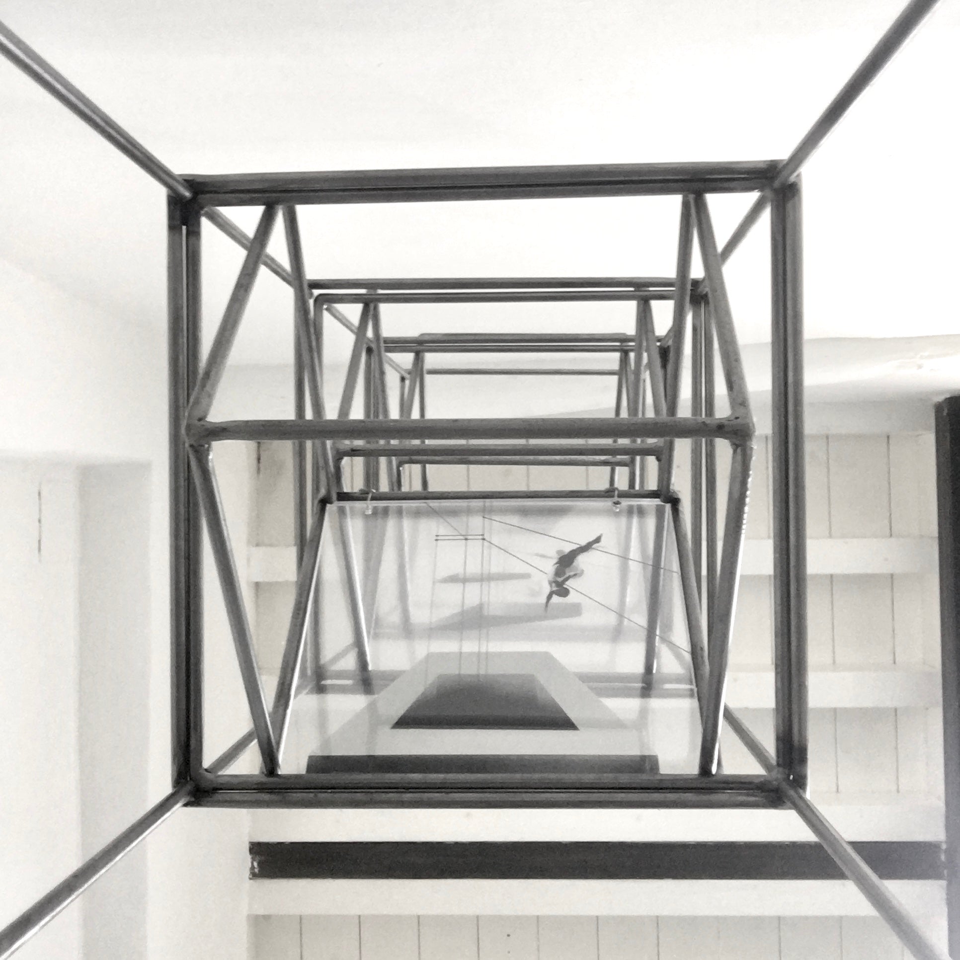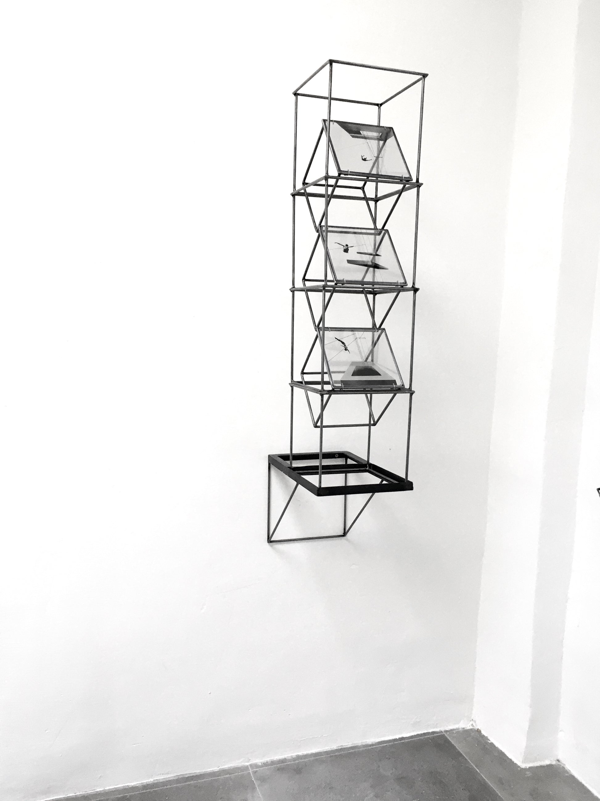 This artwork is composed of two pieces: a modular system forming a near one meter tower of interlocking steel bar cubes with a sequence of three original high quality transparent acrylic prints and a wall structure that fixes the tower to the wall. Appropriate wall screws are provided (only two are needed) and the entire structure is lightweight (can be mounted on plasterboard walls) and easy to assemble.