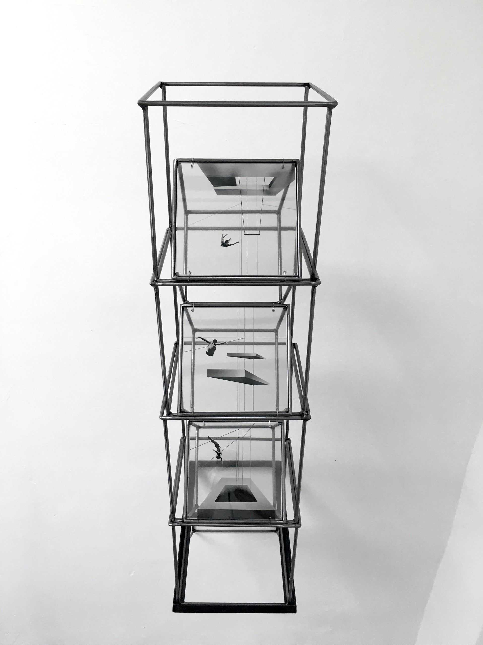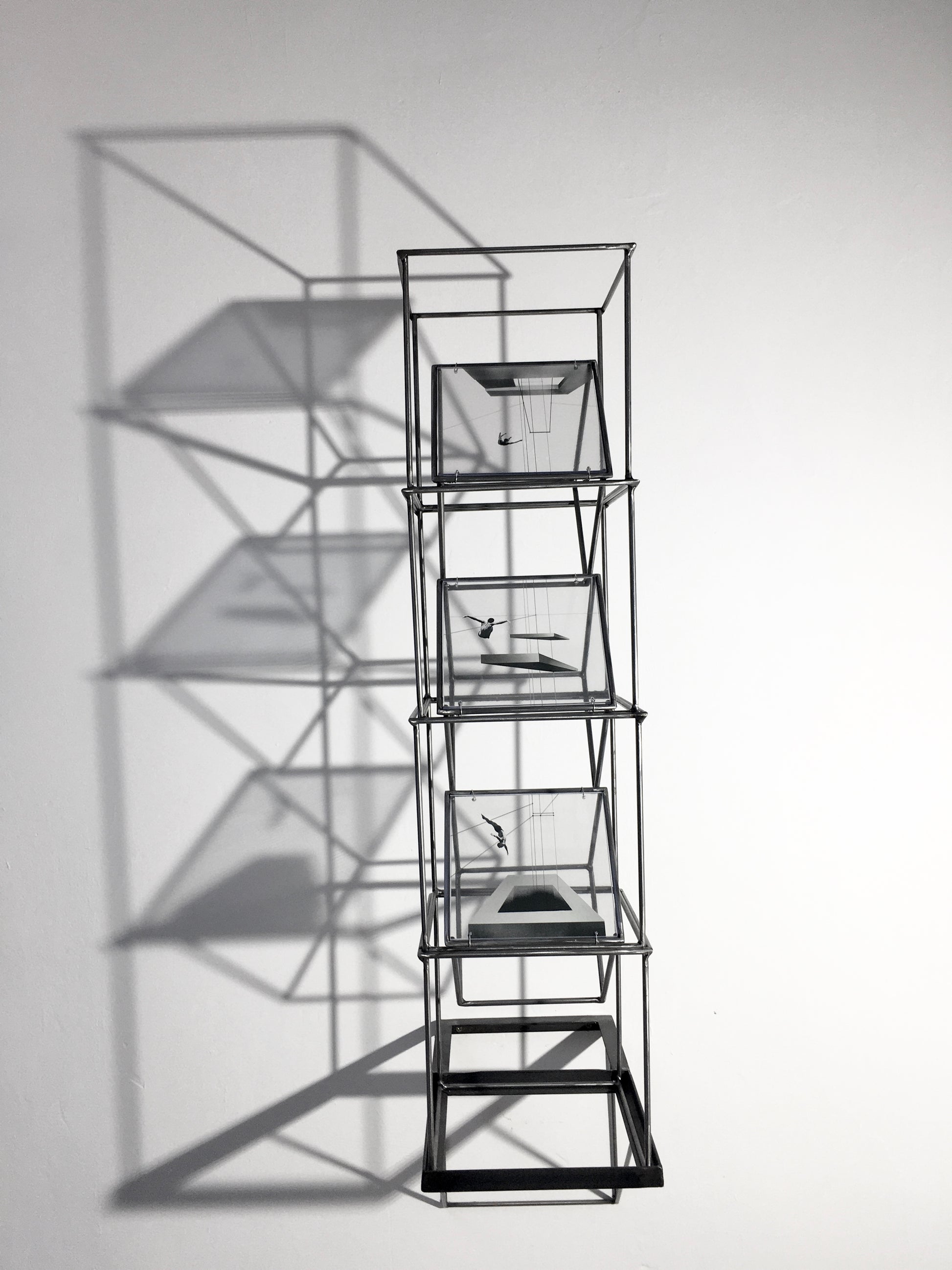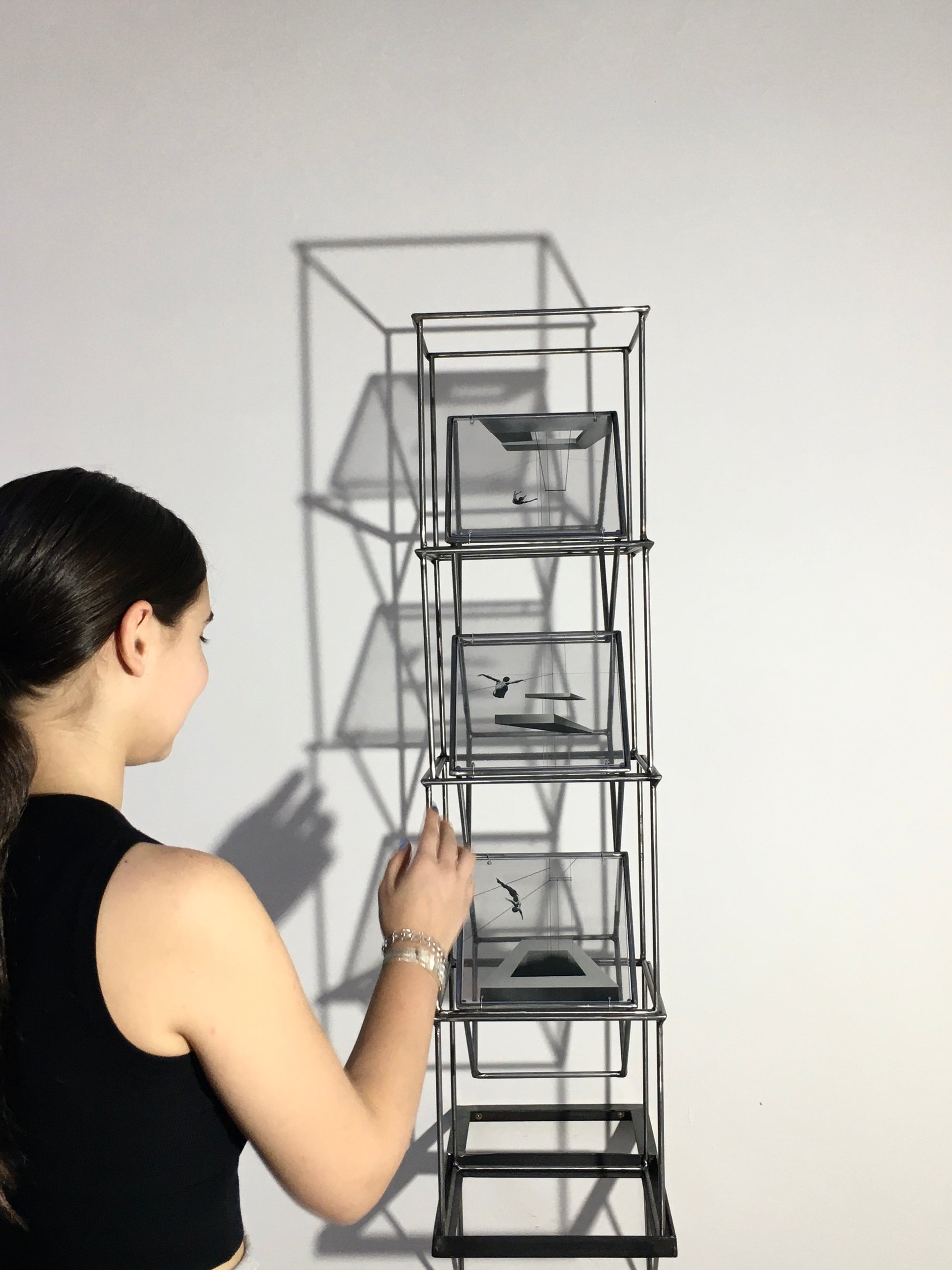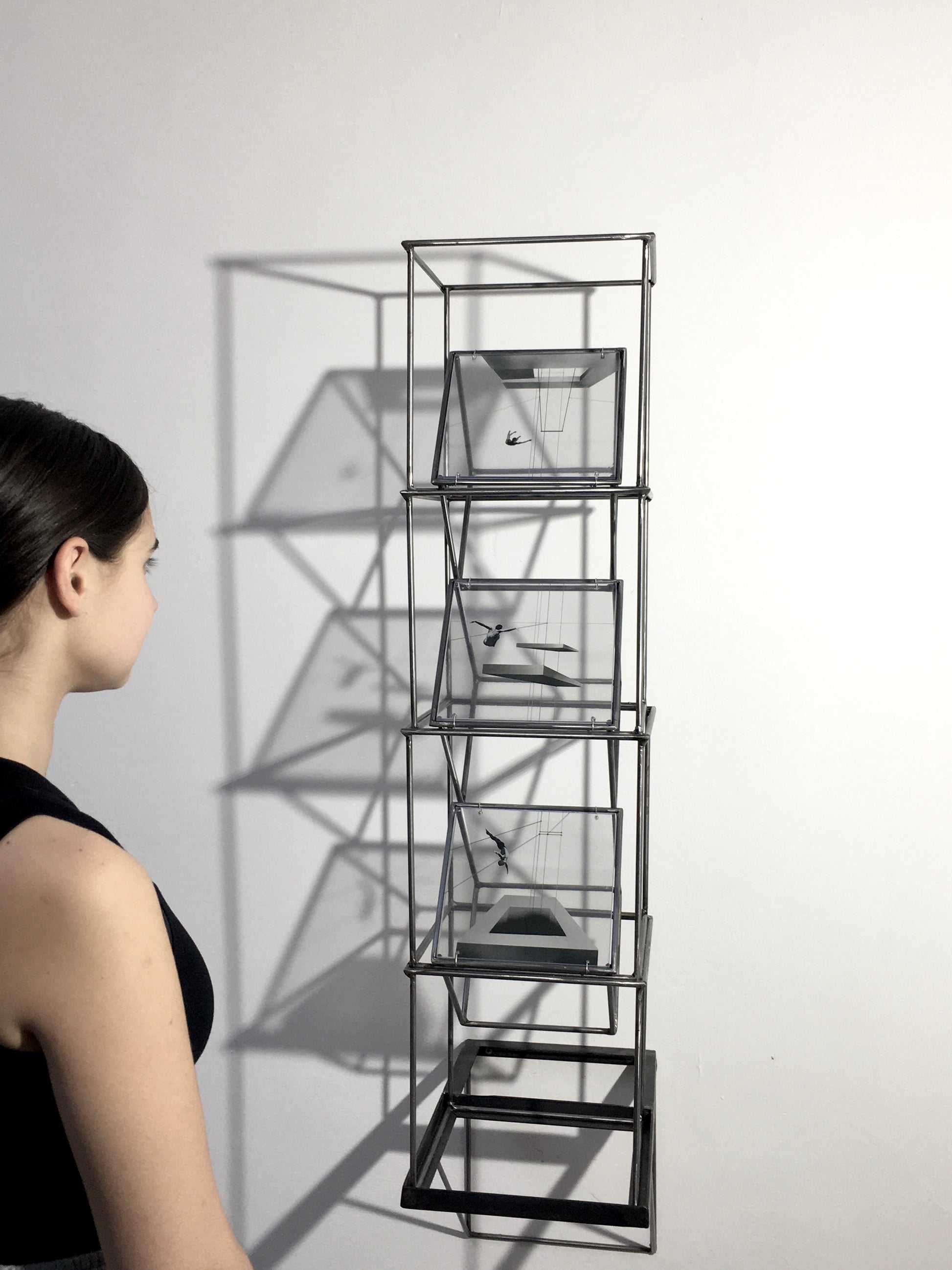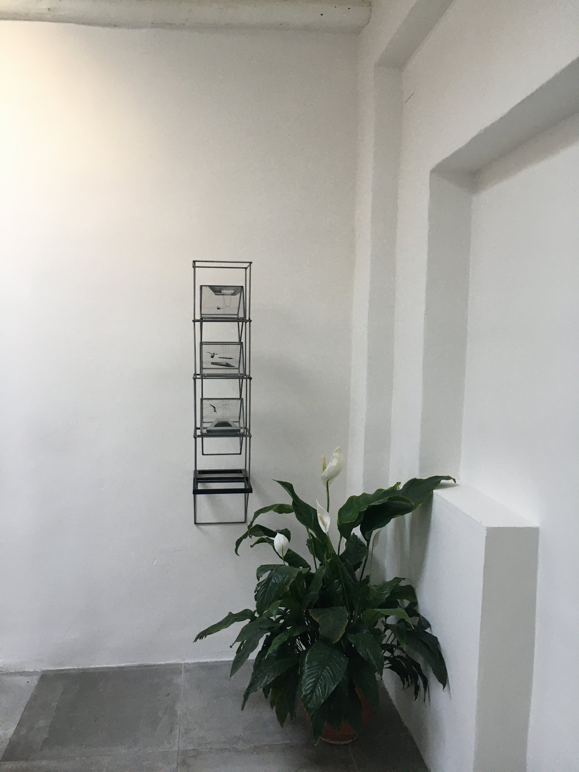 This artwork is composed of two pieces: a modular system forming a near one meter tower of interlocking steel bar cubes with a sequence of three original high quality transparent acrylic prints and a wall structure that fixes the tower to the wall. Appropriate wall screws are provided (only two are needed) and the entire structure is lightweight (can be mounted on plasterboard walls) and easy to assemble.