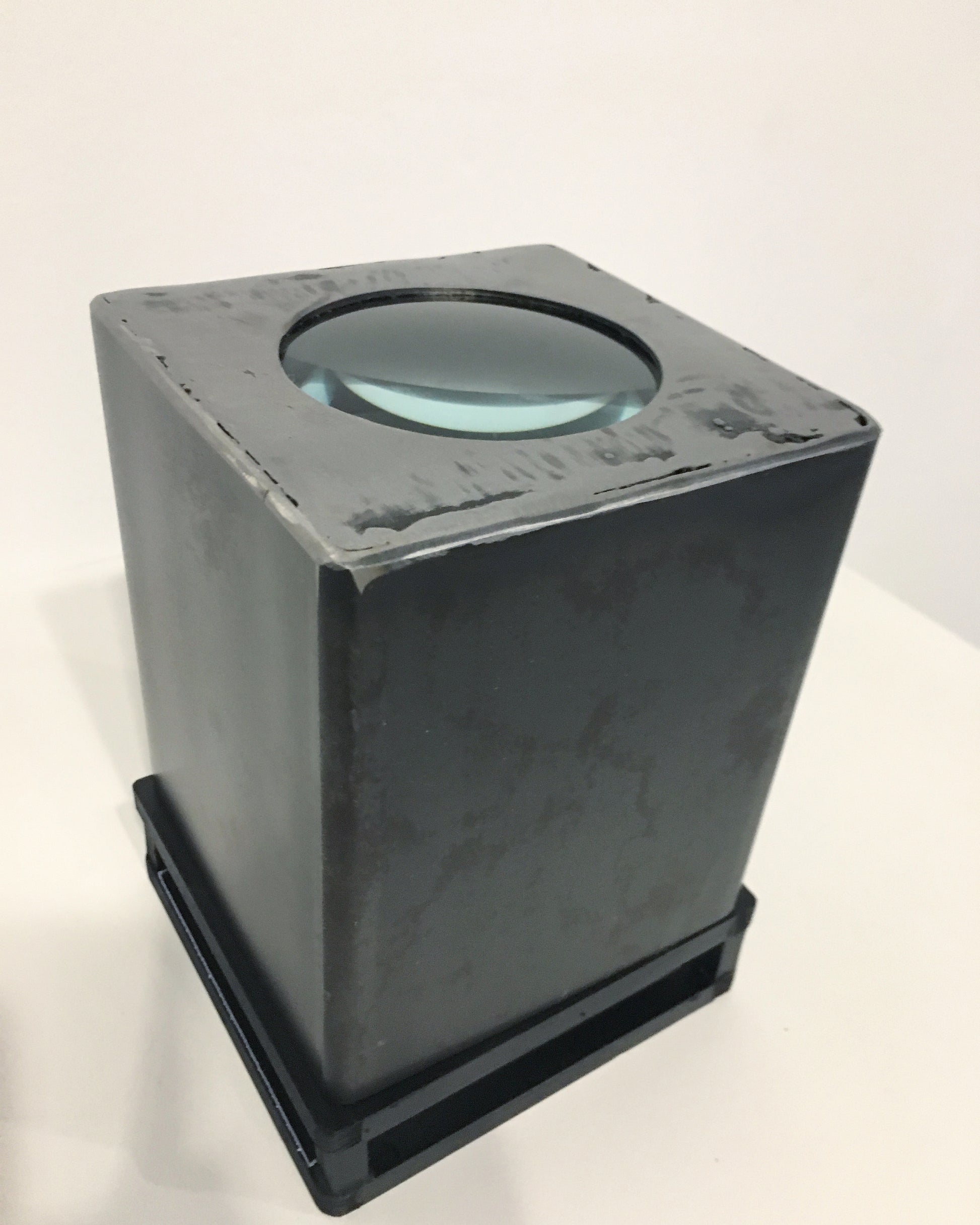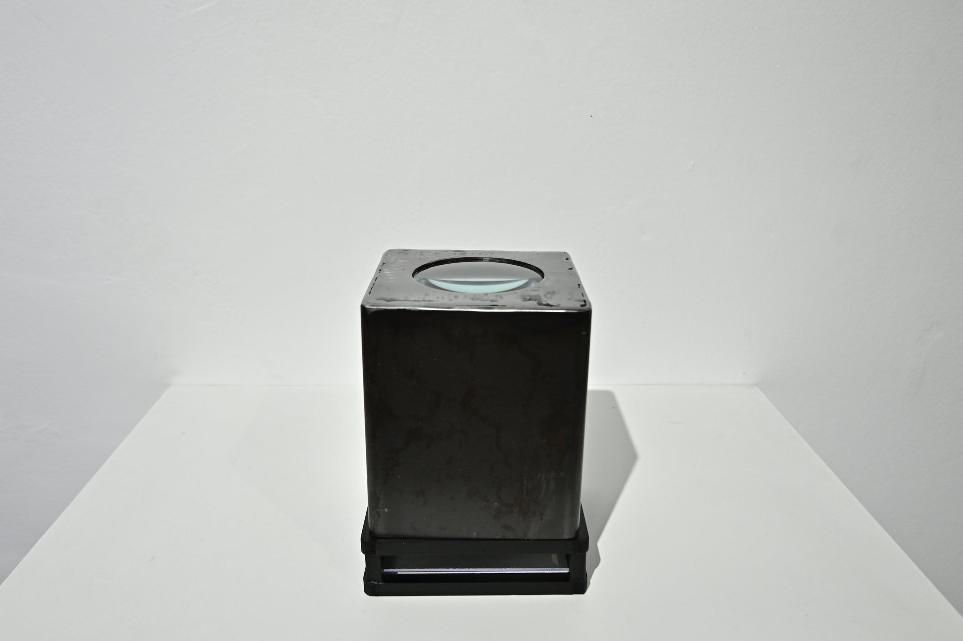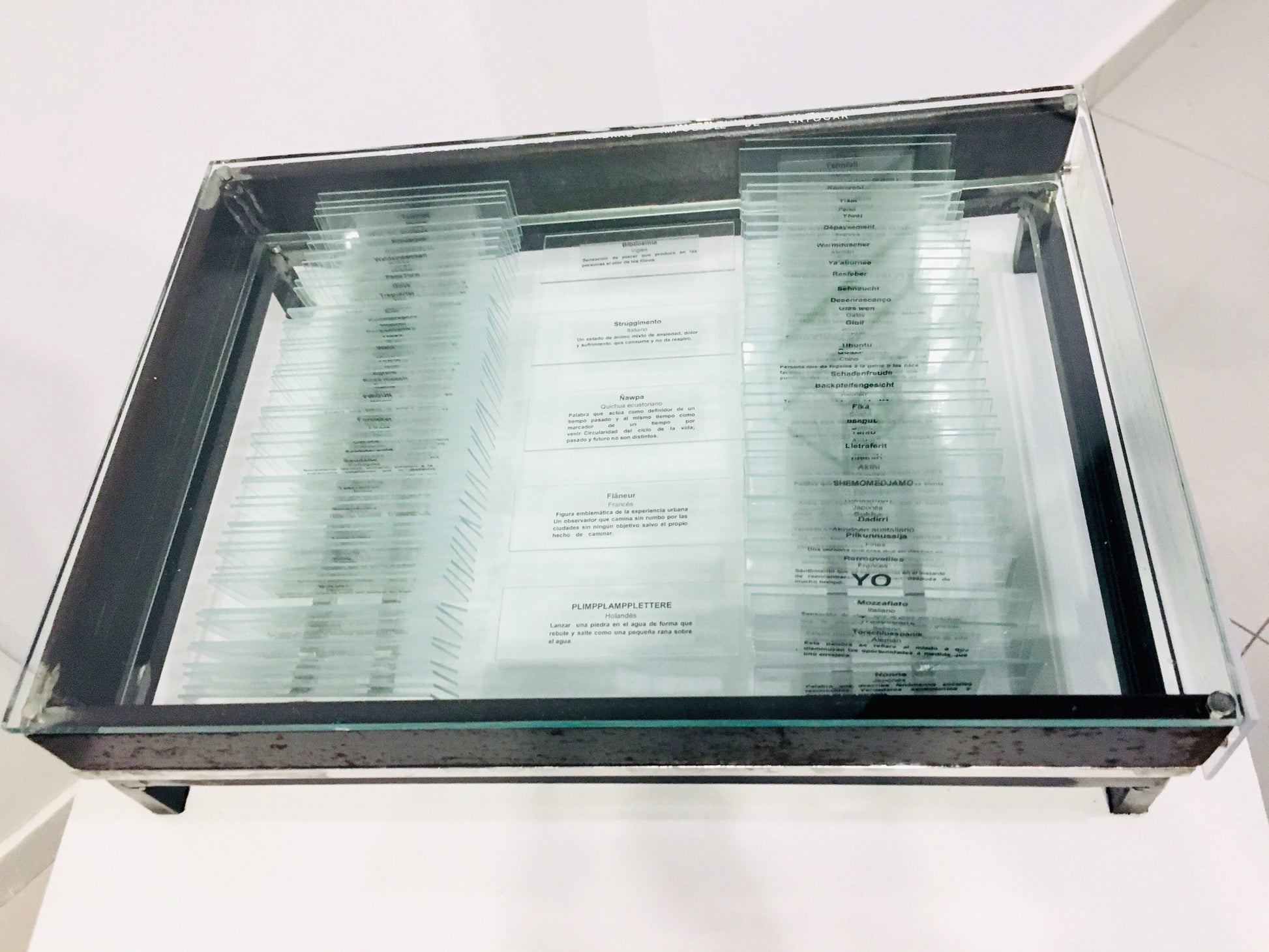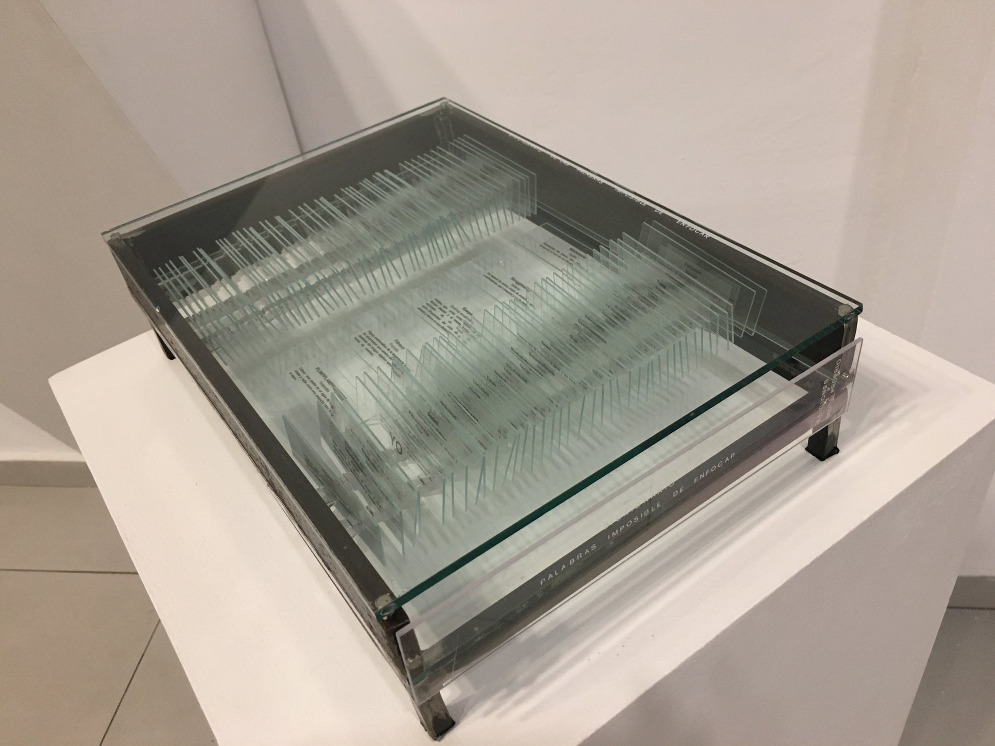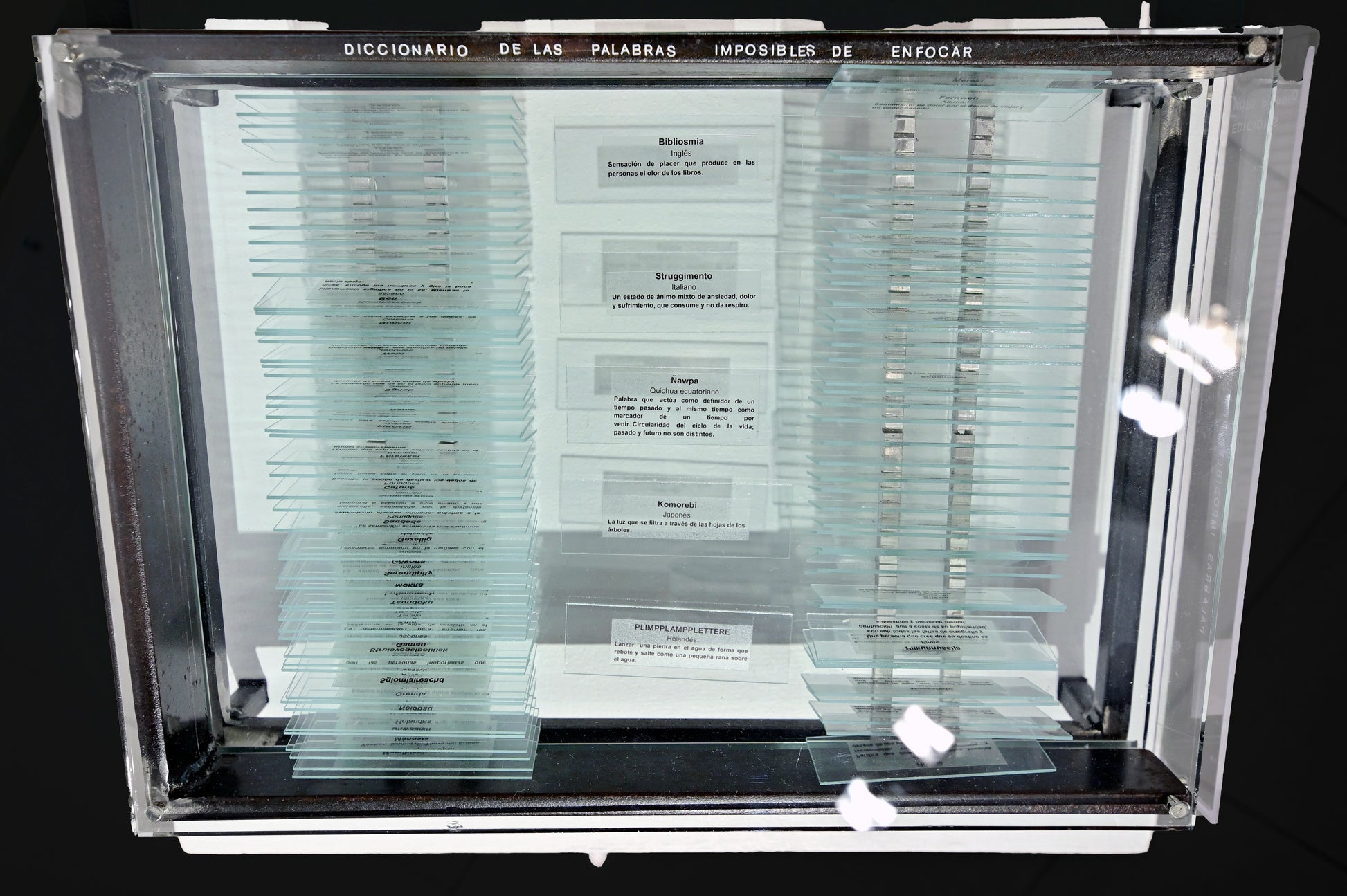 The Dictionary of Words that are Impossible to Focus (Diccionario de palabras imposibles de enfocar) is a two piece sculpture featuring a dictionary of words from many languages (Japanese, English, German, Arabic etc) with translations in Spanish framed on microscope slides, and a second sculpture, a handmade microscope with a single word on a slide magnified under a lens. There are just under 100 words in the dictionary all selected for their cultural singularity, words like: Gurfa, which in Arabic means the amount of water that can be held in the hands or Komorebi, which is the Japanese word for the light that filters through the leaves of trees. These are words which can be translated at some level (and of course in their physical form can be brought into focus under a microscope) but which seem to require some extra level of cultural awareness, situation and so on to get the true significance and nuance. There is the sense that the translation leaves something about the word still blurred, obscured and ineffable. This piece is emblematic of a recurring Furst_Ori theme concerning the limits of language. The dictionary itself is handmade from steel, glass, and acrylic sheet, with removable panels held in place by magnets so that the words on the slides can be inspected and rearranged at will. Signed by Ori.