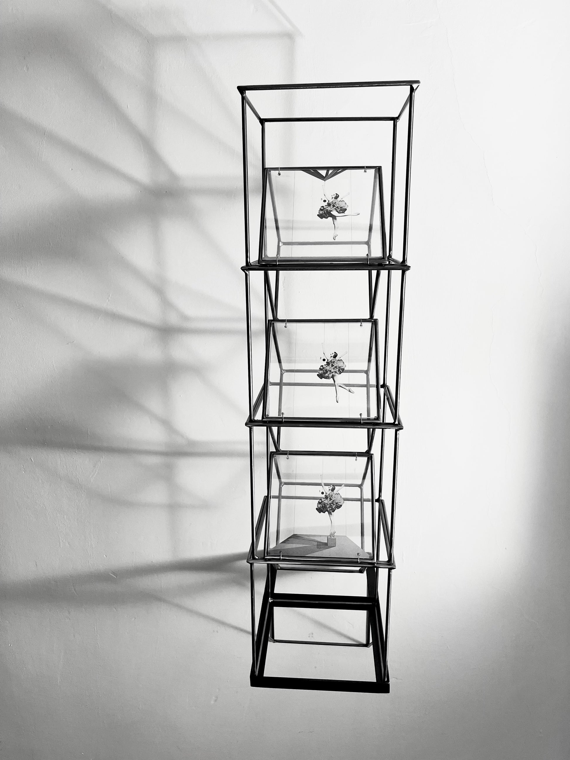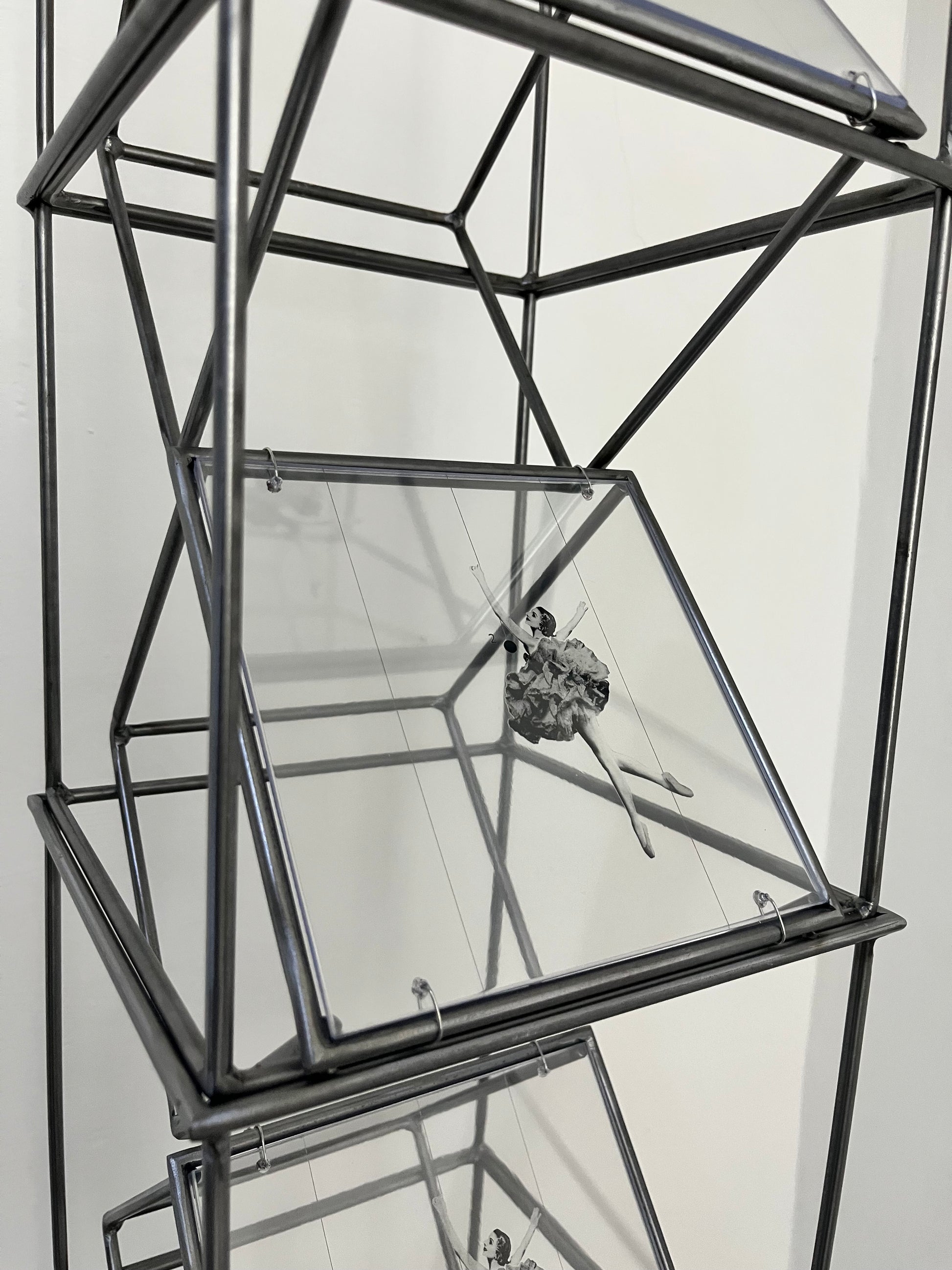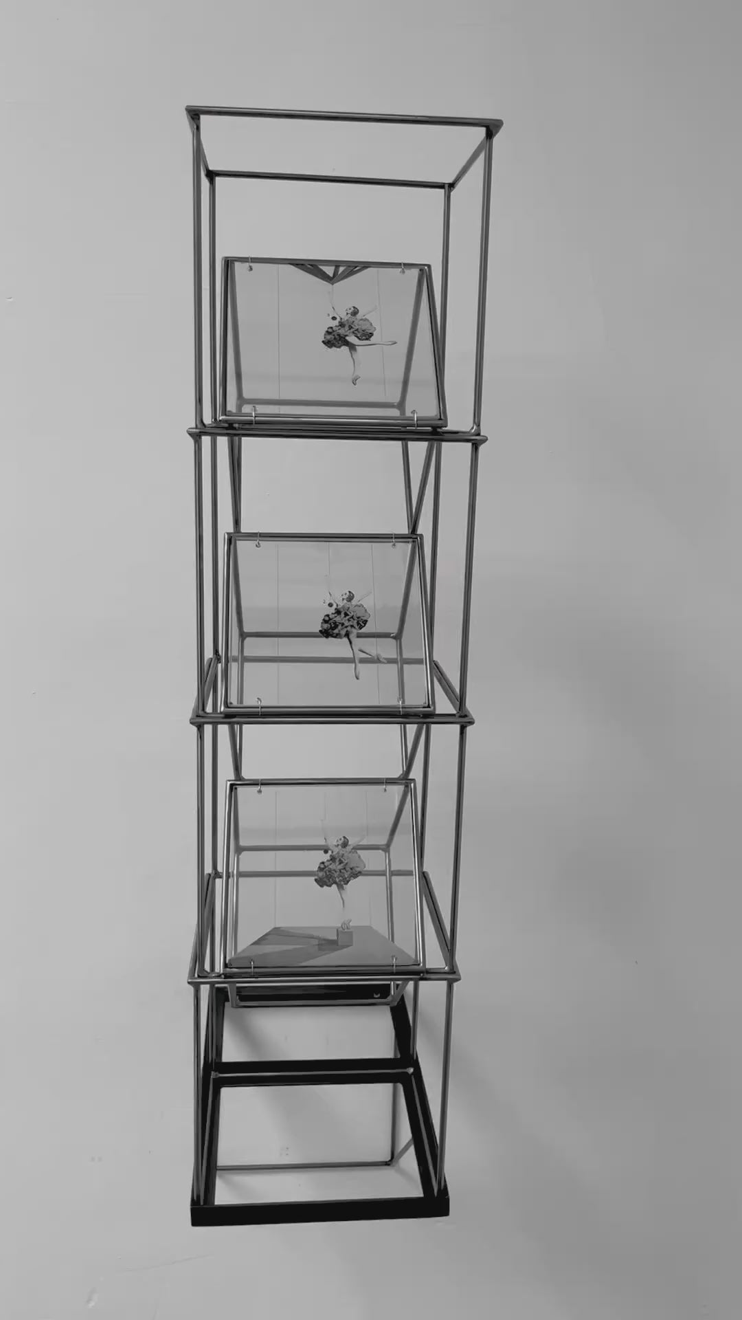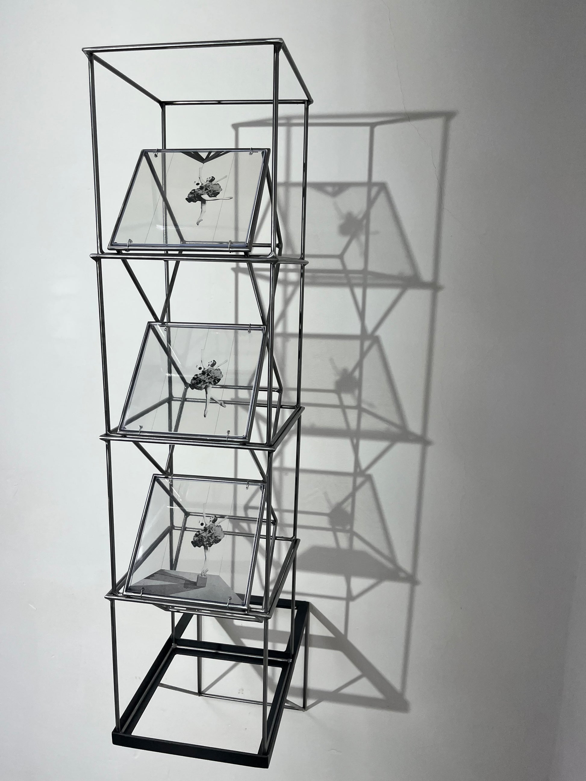 This artwork is composed of two pieces: a modular system forming a near one meter tower of interlocking steel bar cubes with a sequence of three original high quality transparent acrylic prints and a wall structure that fixes the tower to the wall. Appropriate wall screws are provided (only two are needed) and the entire structure is lightweight (can be mounted on plasterboard walls) and easy to assemble. The tower is packedged in a high quality purpose built wooden art crate for a safe delivery.