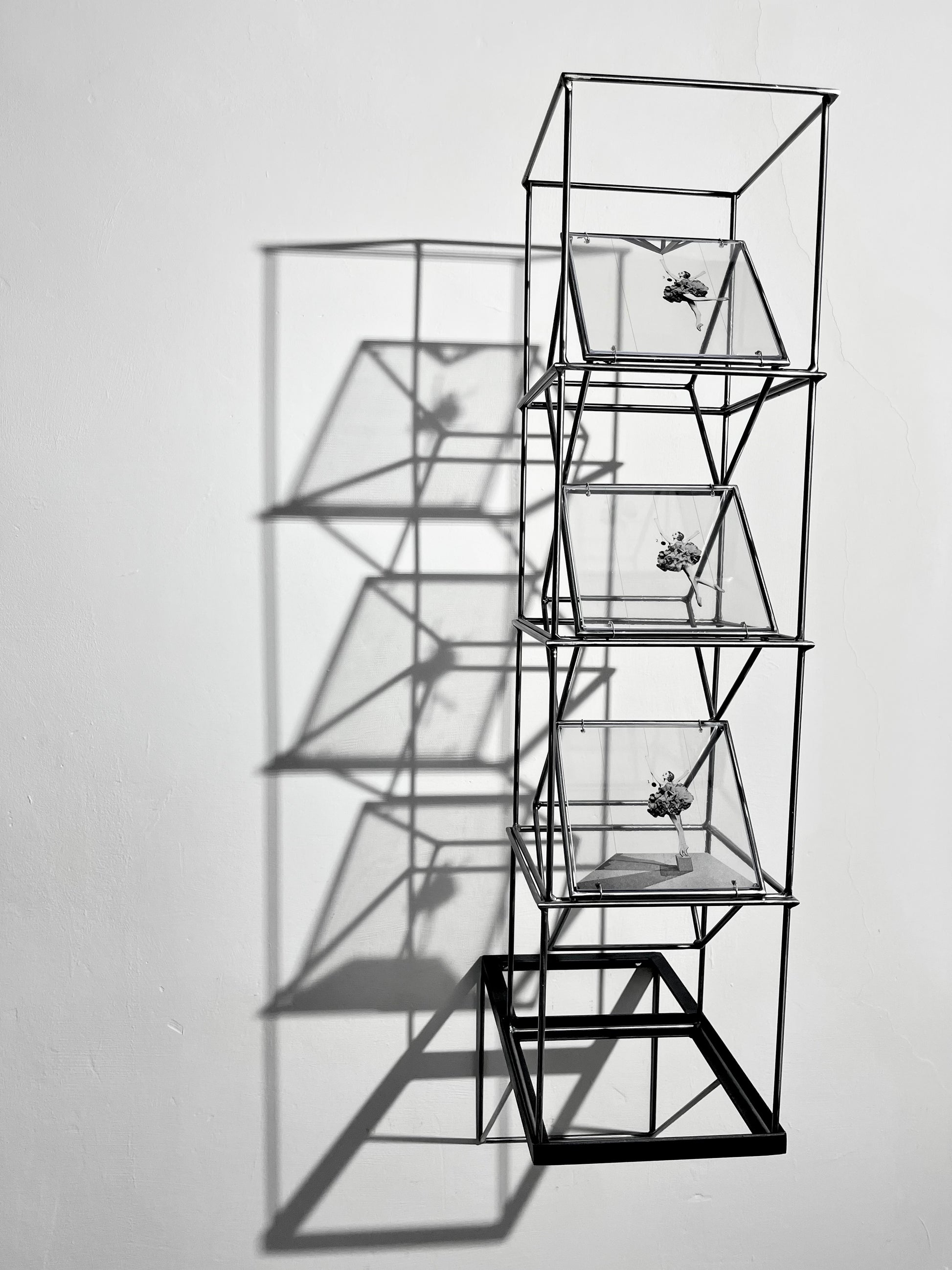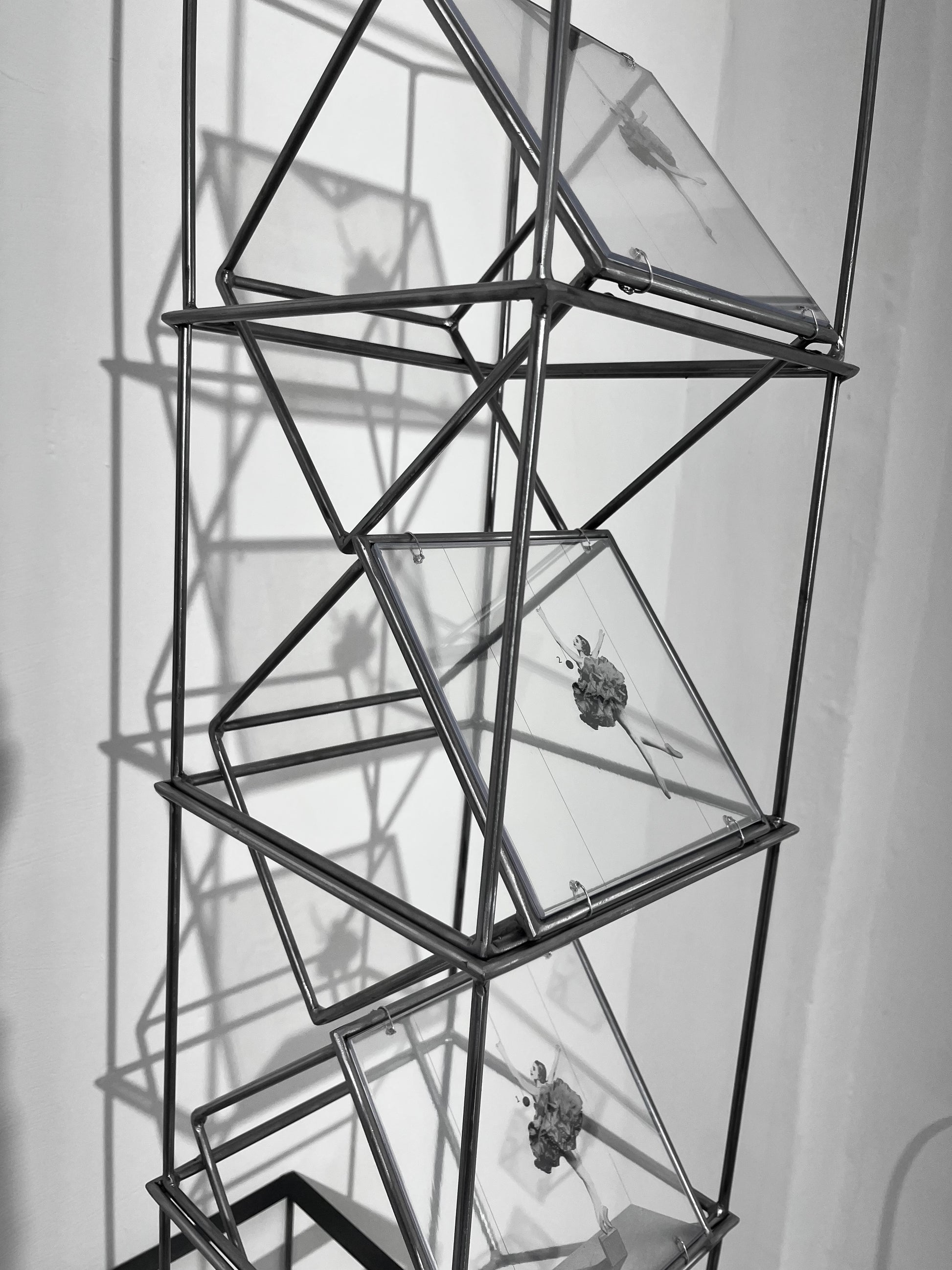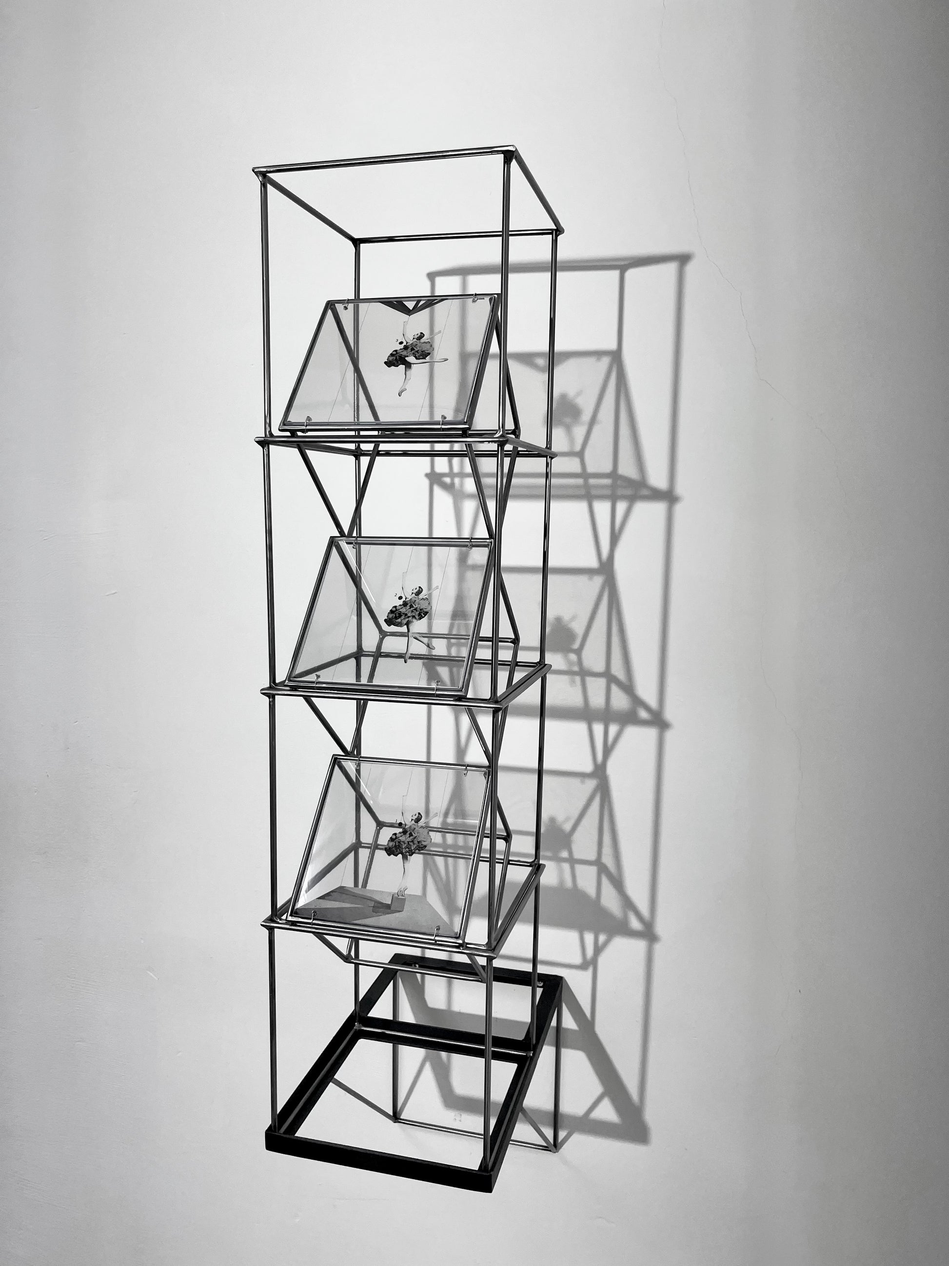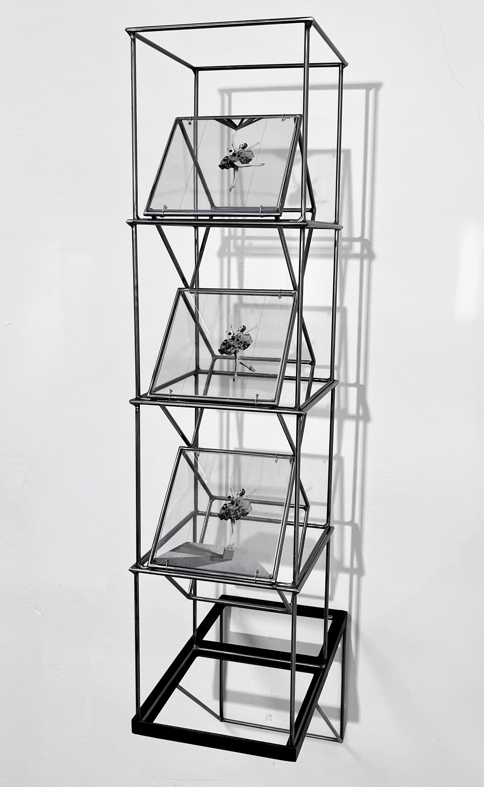 This artwork is composed of two pieces: a modular system forming a near one meter tower of interlocking steel bar cubes with a sequence of three original high quality transparent acrylic prints and a wall structure that fixes the tower to the wall. Appropriate wall screws are provided (only two are needed) and the entire structure is lightweight (can be mounted on plasterboard walls) and easy to assemble. The tower is packedged in a high quality purpose built wooden art crate for a safe delivery.