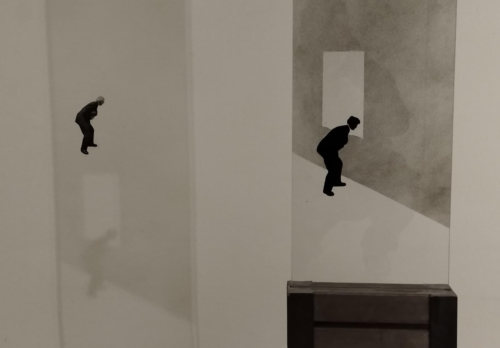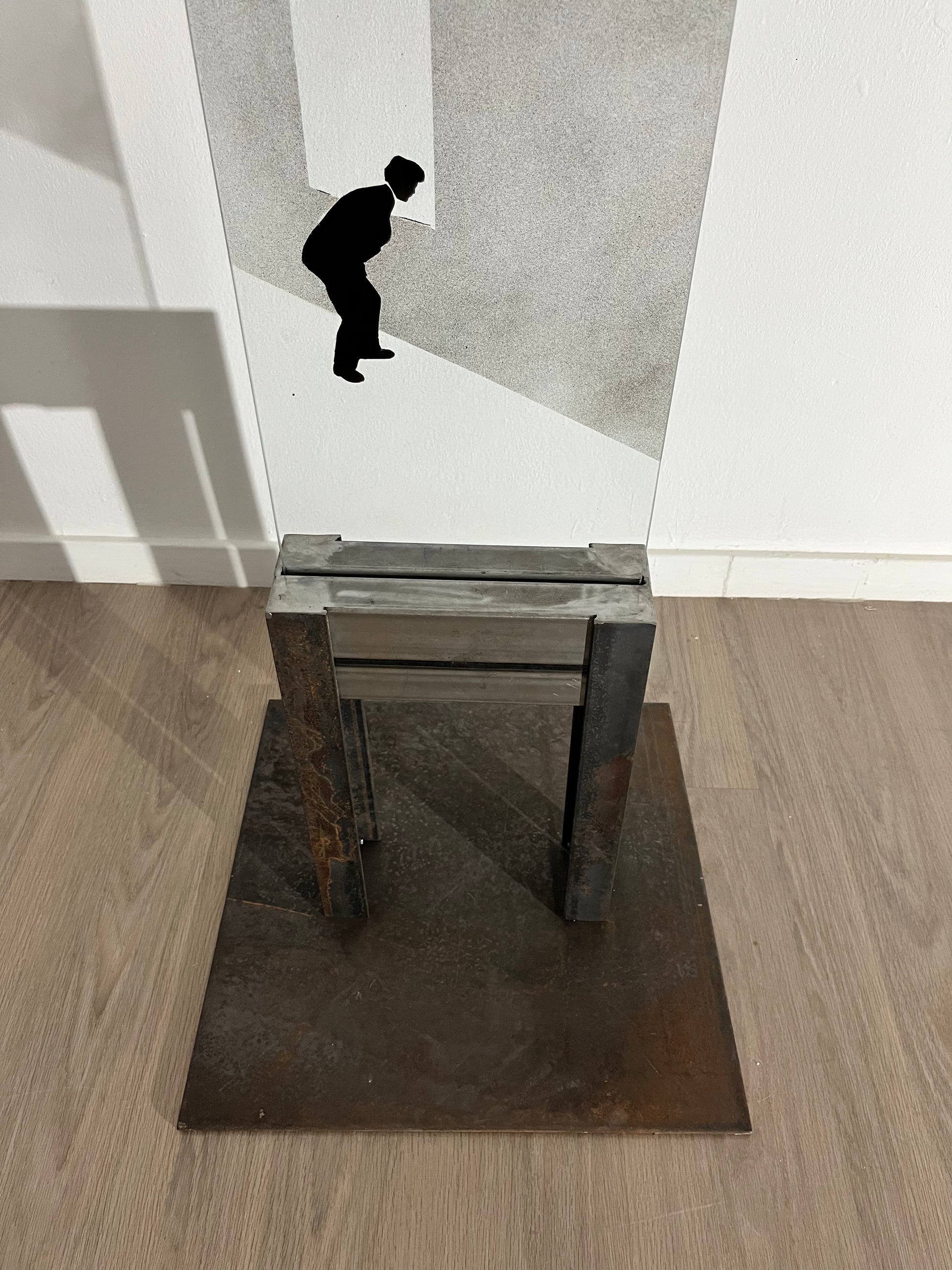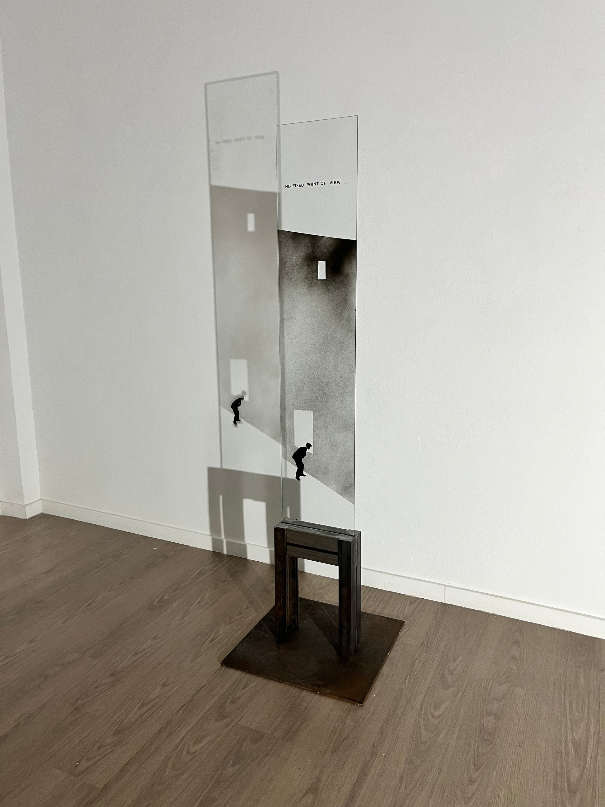 No Fixed Point of View. A hand painted glass panel anchored in a welded steel base. The shadow plays with a collage glued to the wall of the shadow figure drawn on the glass. Originally presented with a kinetic light source so that the shadow and the collage on the wall separated and merged periodically,