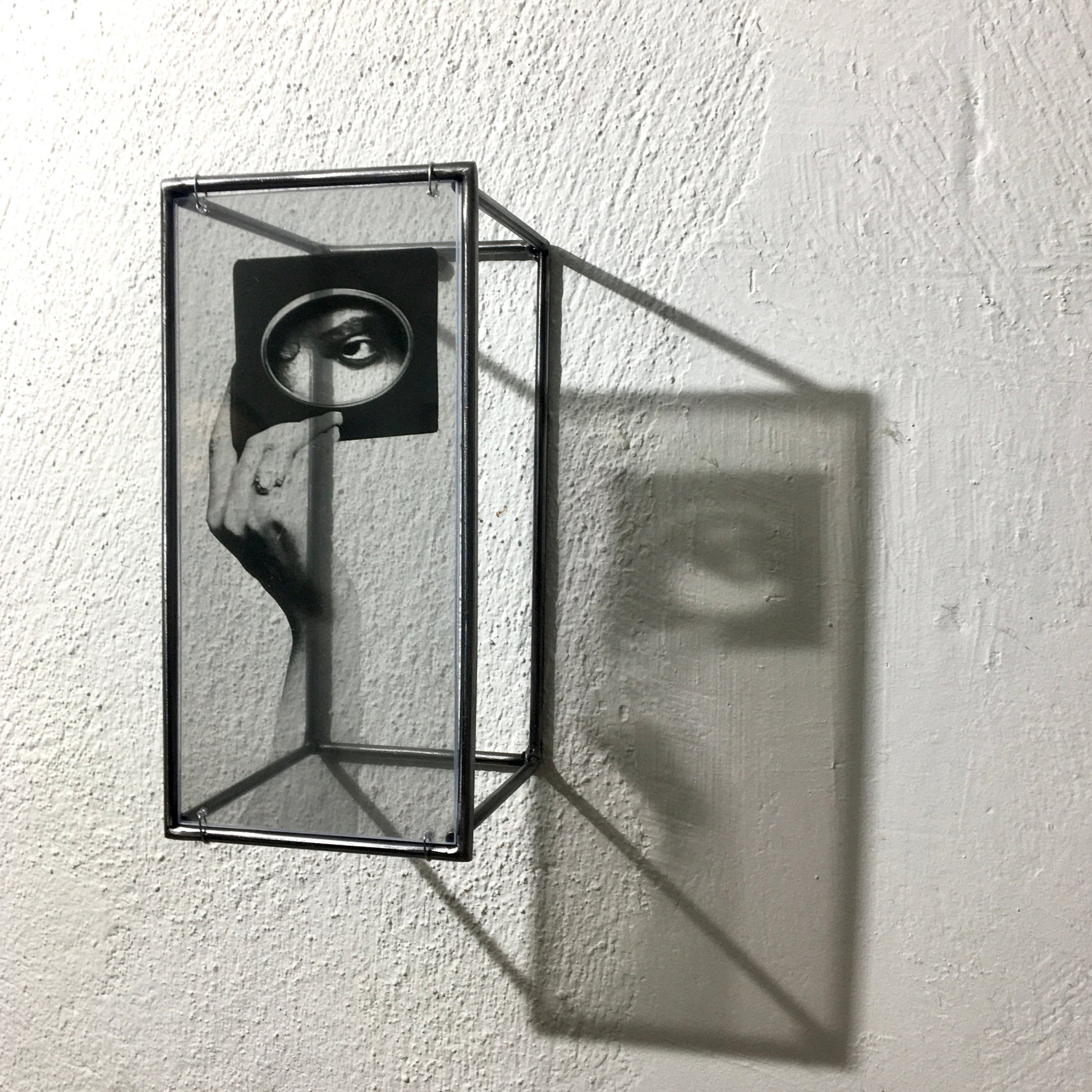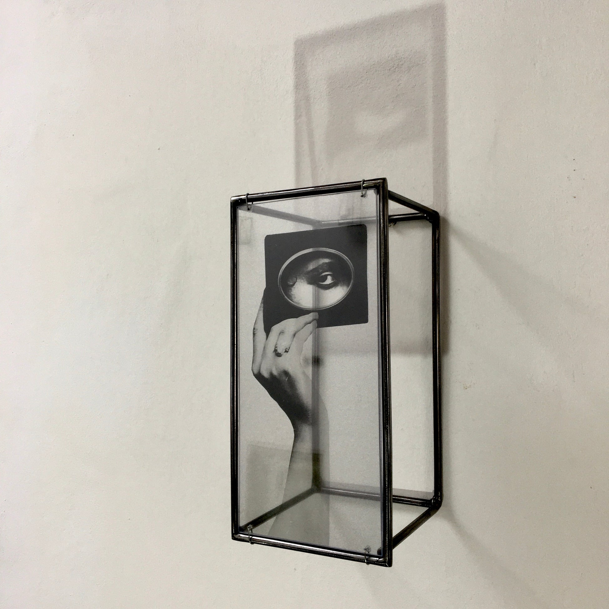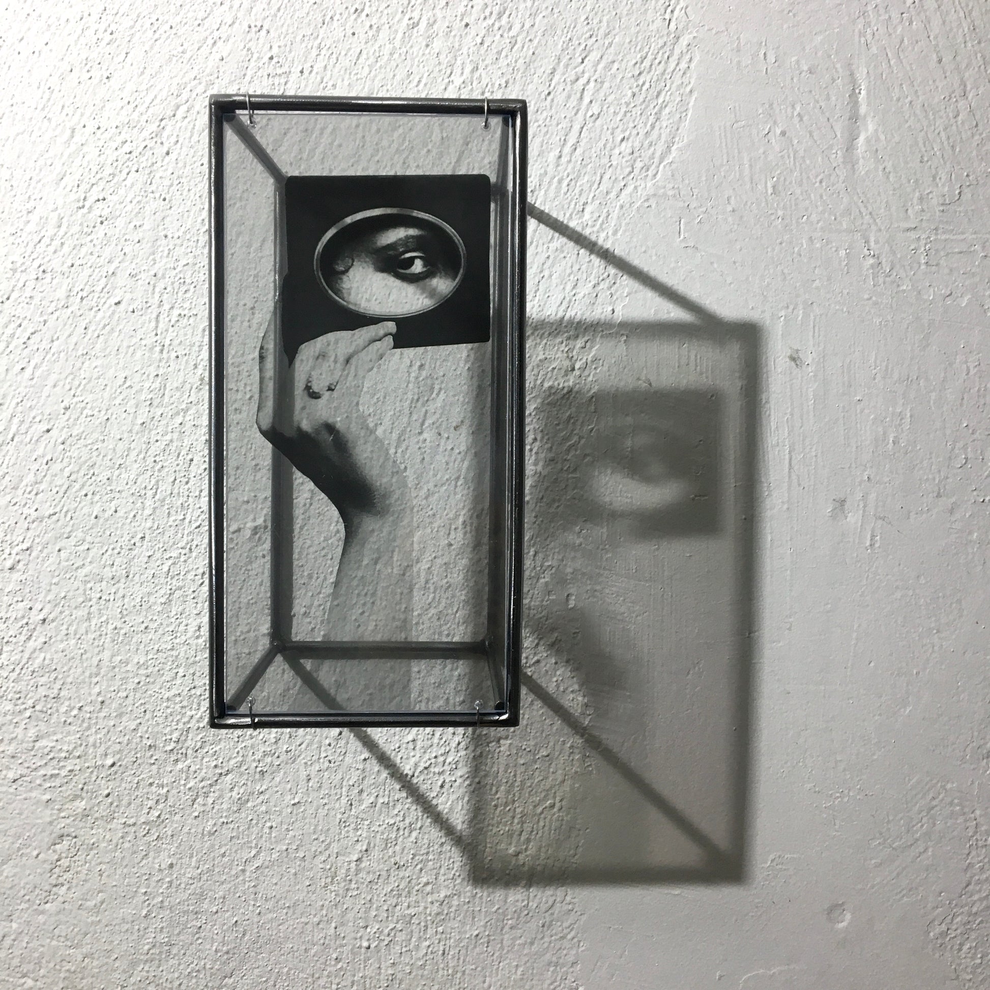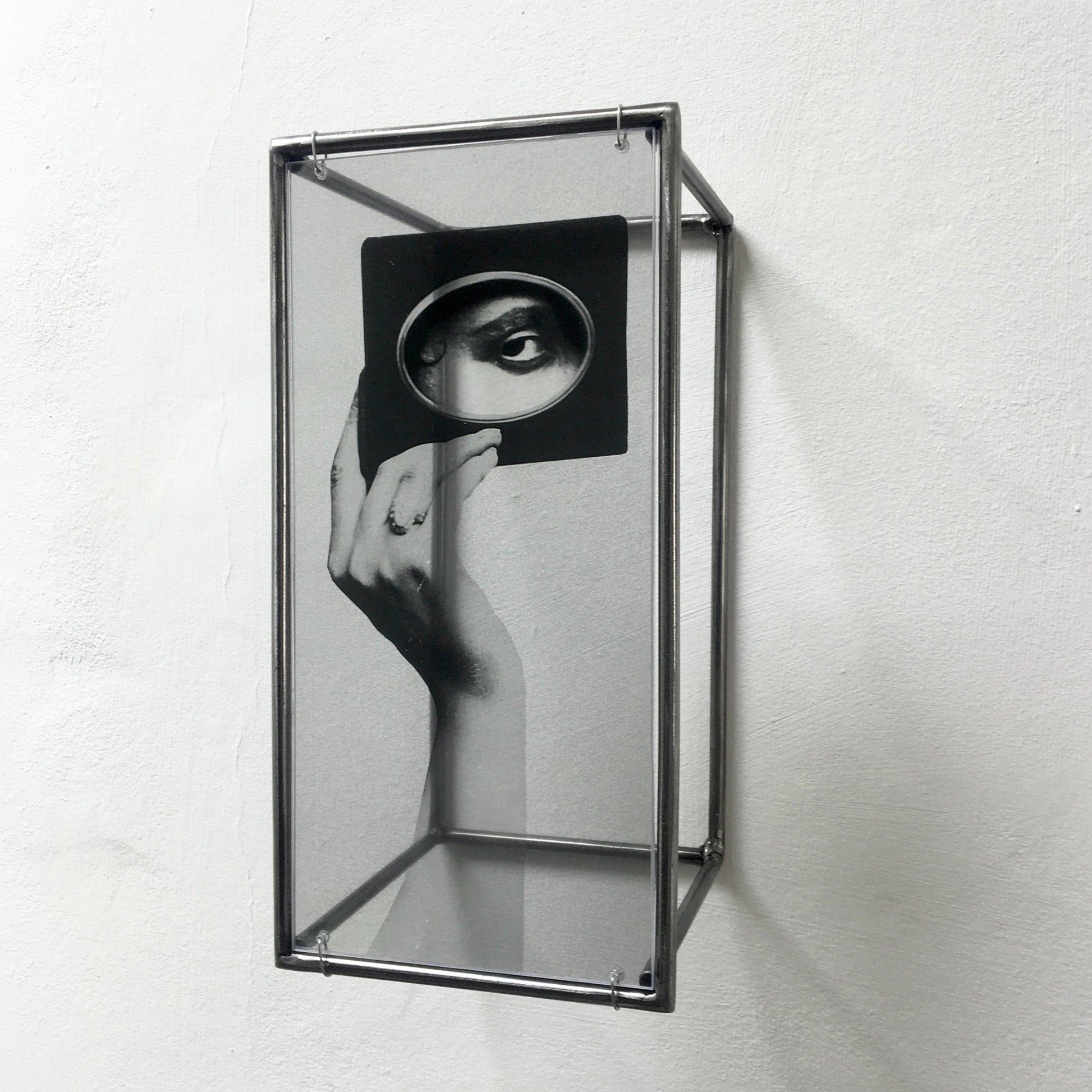 Looking to create a sensual and mysterious focal point for your wall or room? Surrealist collage with hand and eye theme based on a vintage photograph set in a steel handmade wall sculpture. Simple, elegant and sensual, the eye motif will automatically create a visual focal point within any interior design setting.