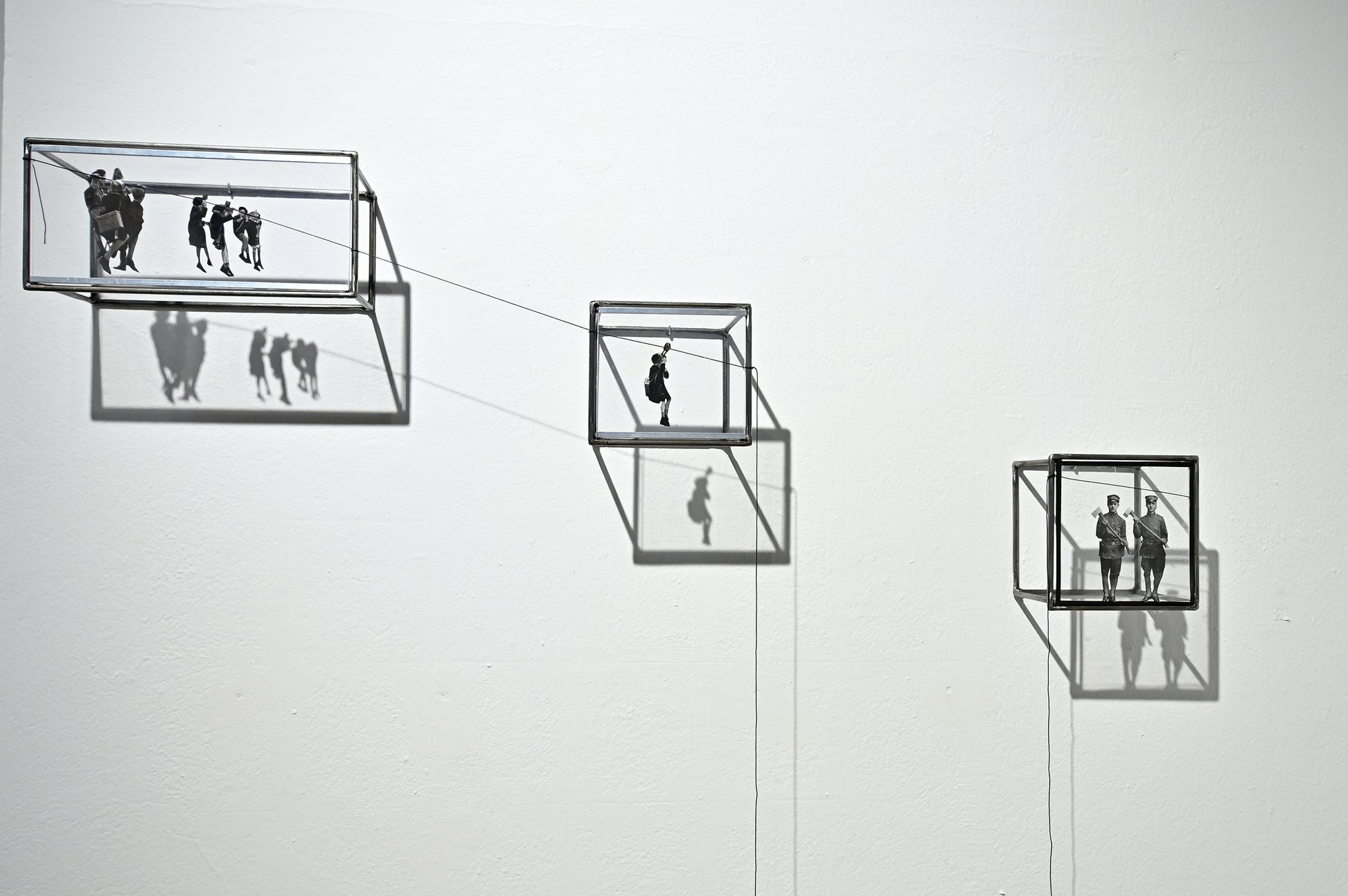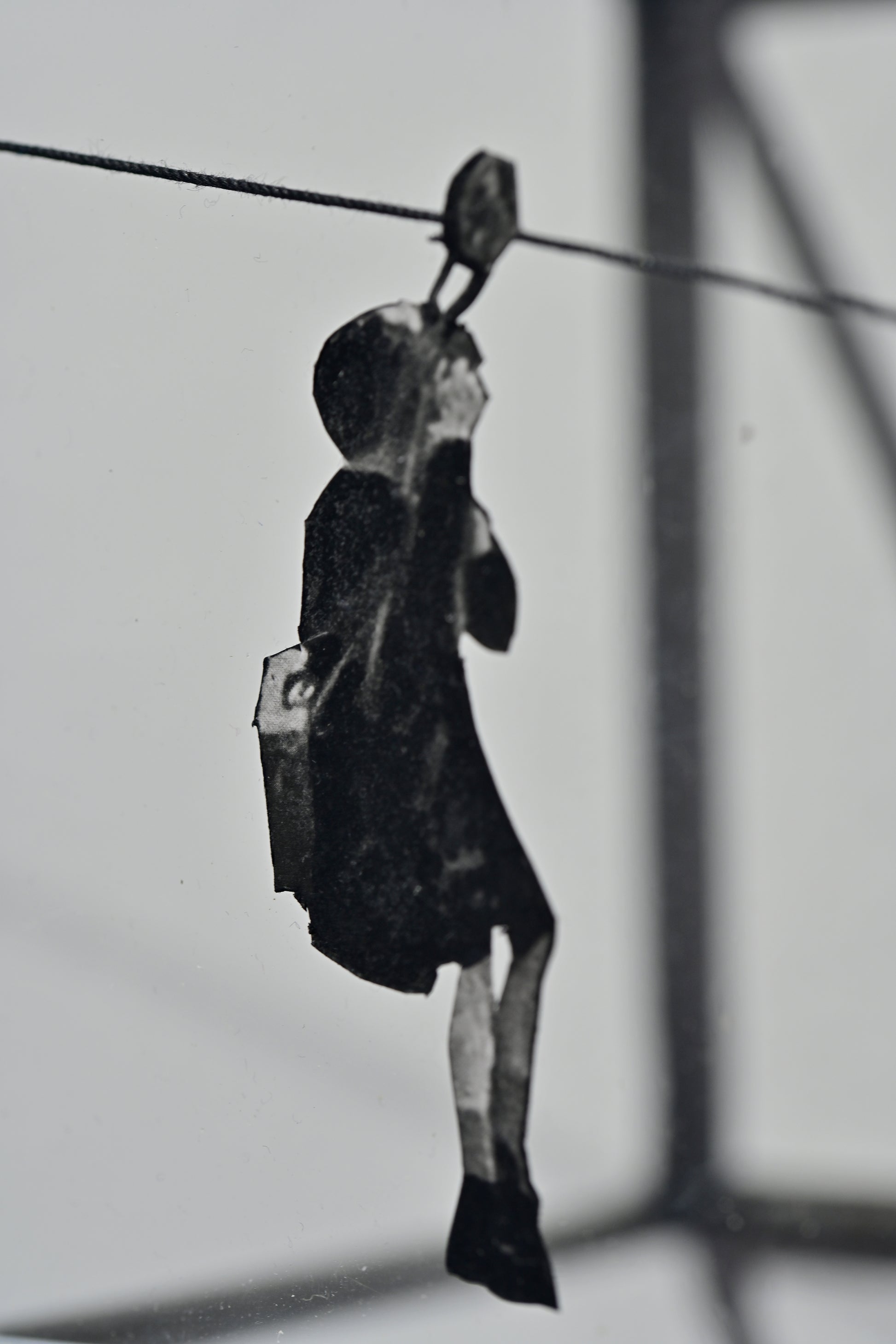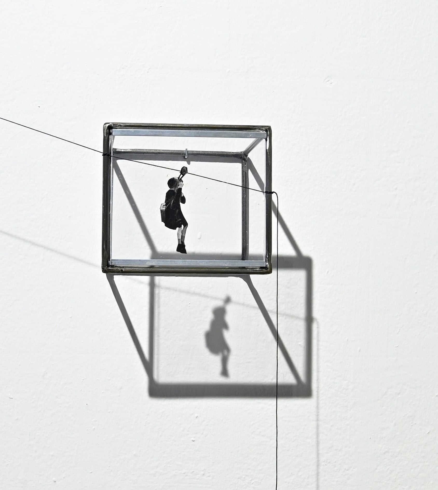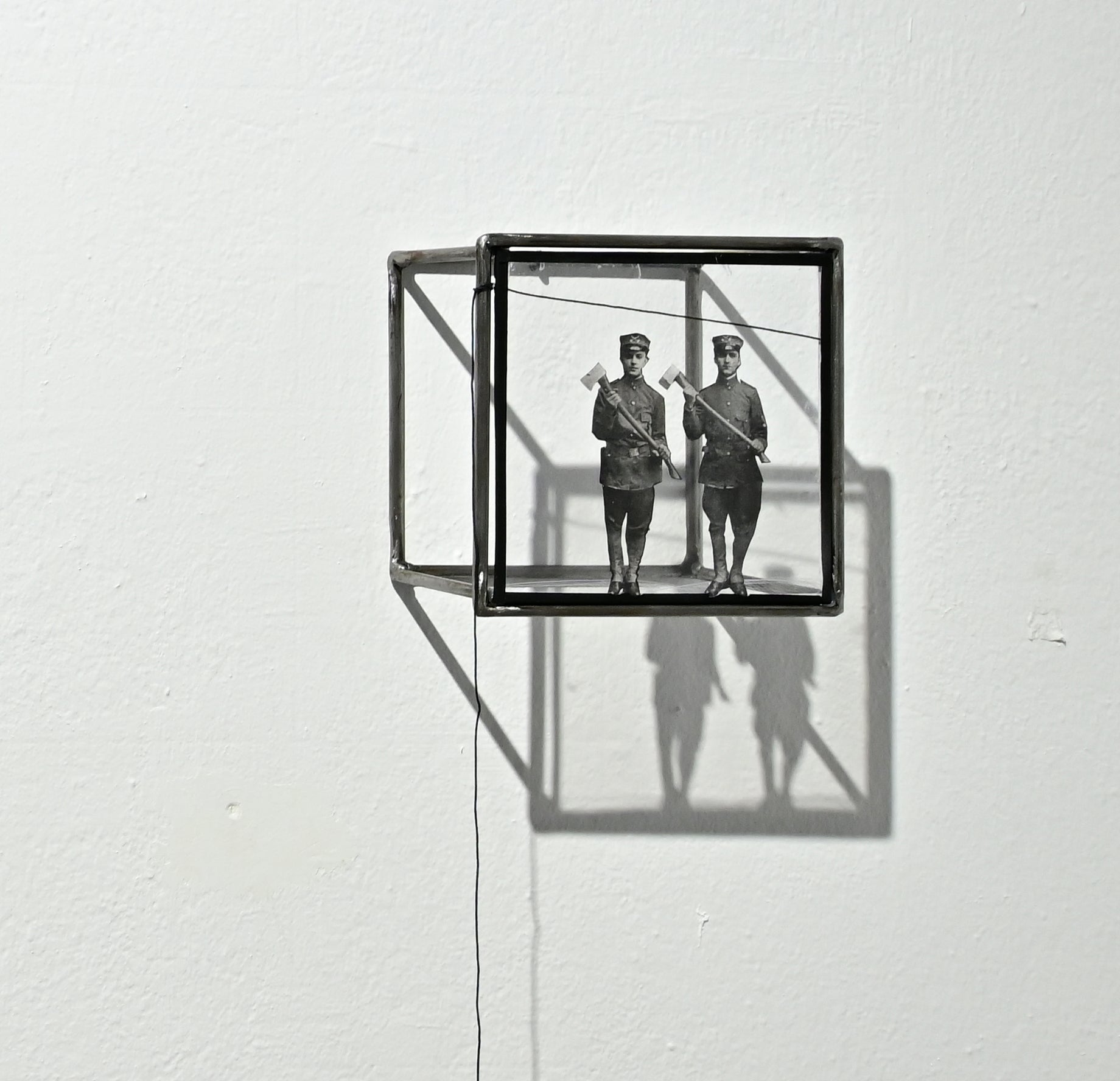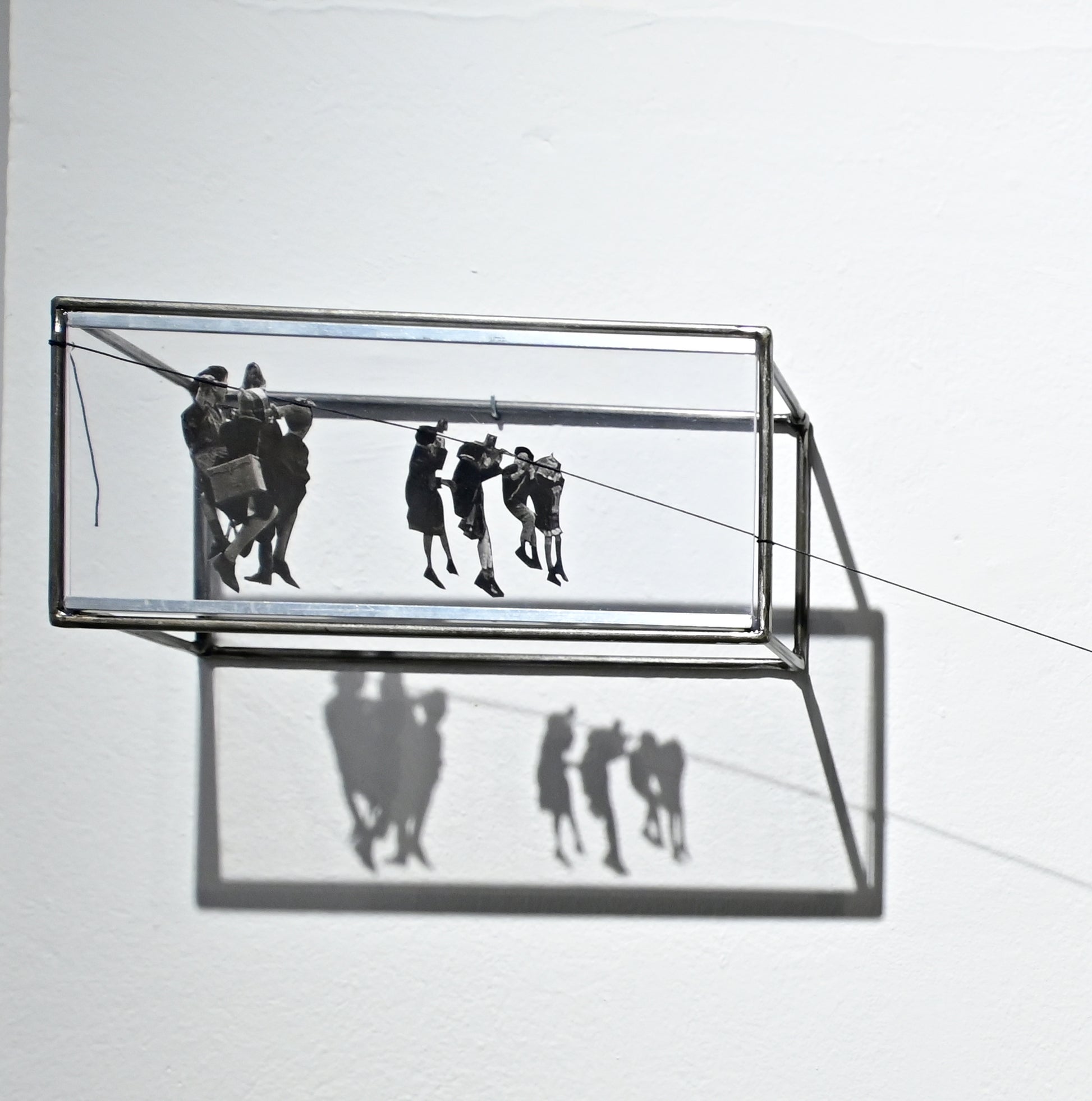 Collage of two proudly posing woodmen showing off their handiwork: the severing of a cable sustaining a group of schoolchildren on a zip line. One of the Woodman series exploring the darker moral possibilities of the selfie. Two dimensional image making housed in a three dimensional sculpture that, depending on the lighting available, turns the work into a small shadow theatre. When displayed according to the photograph the dimension of wall taken up by the three sculptures is 120cm X 50cm.